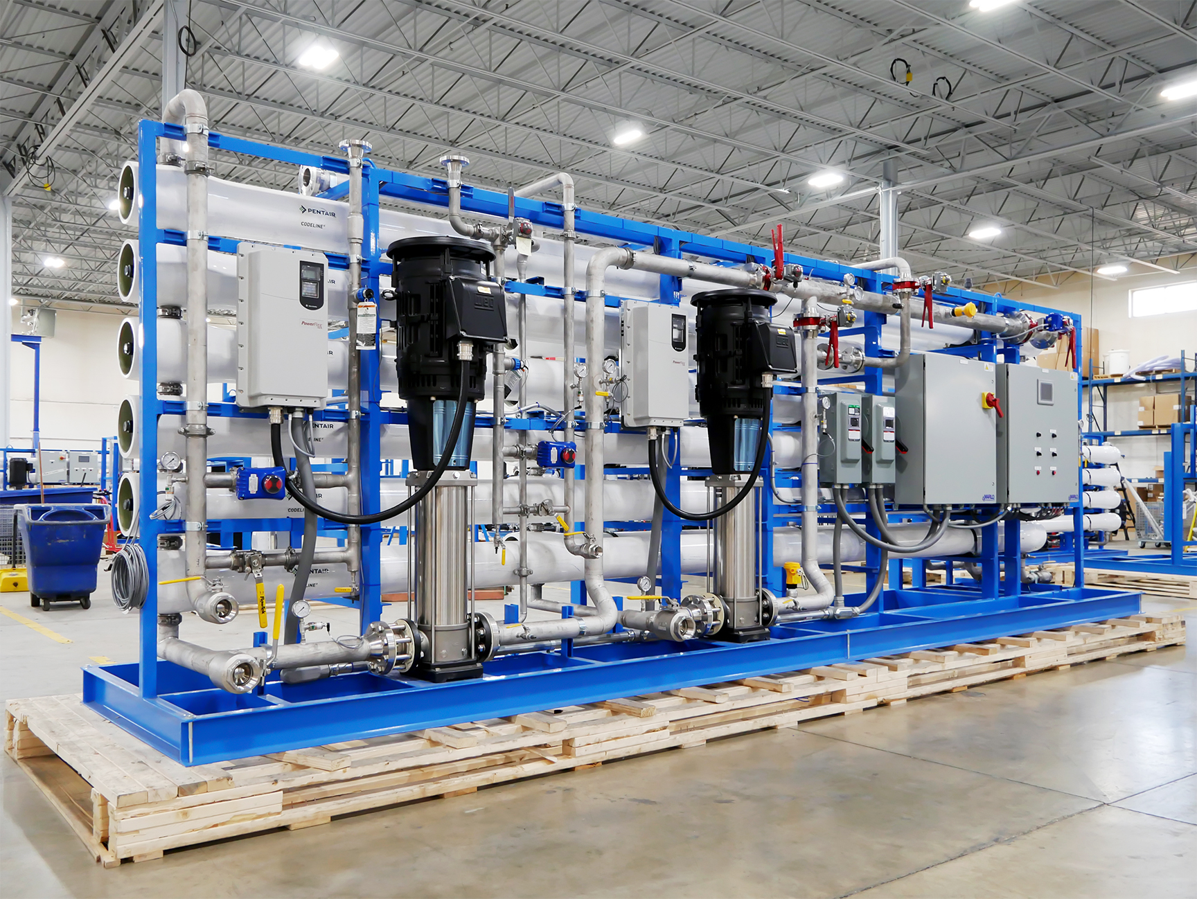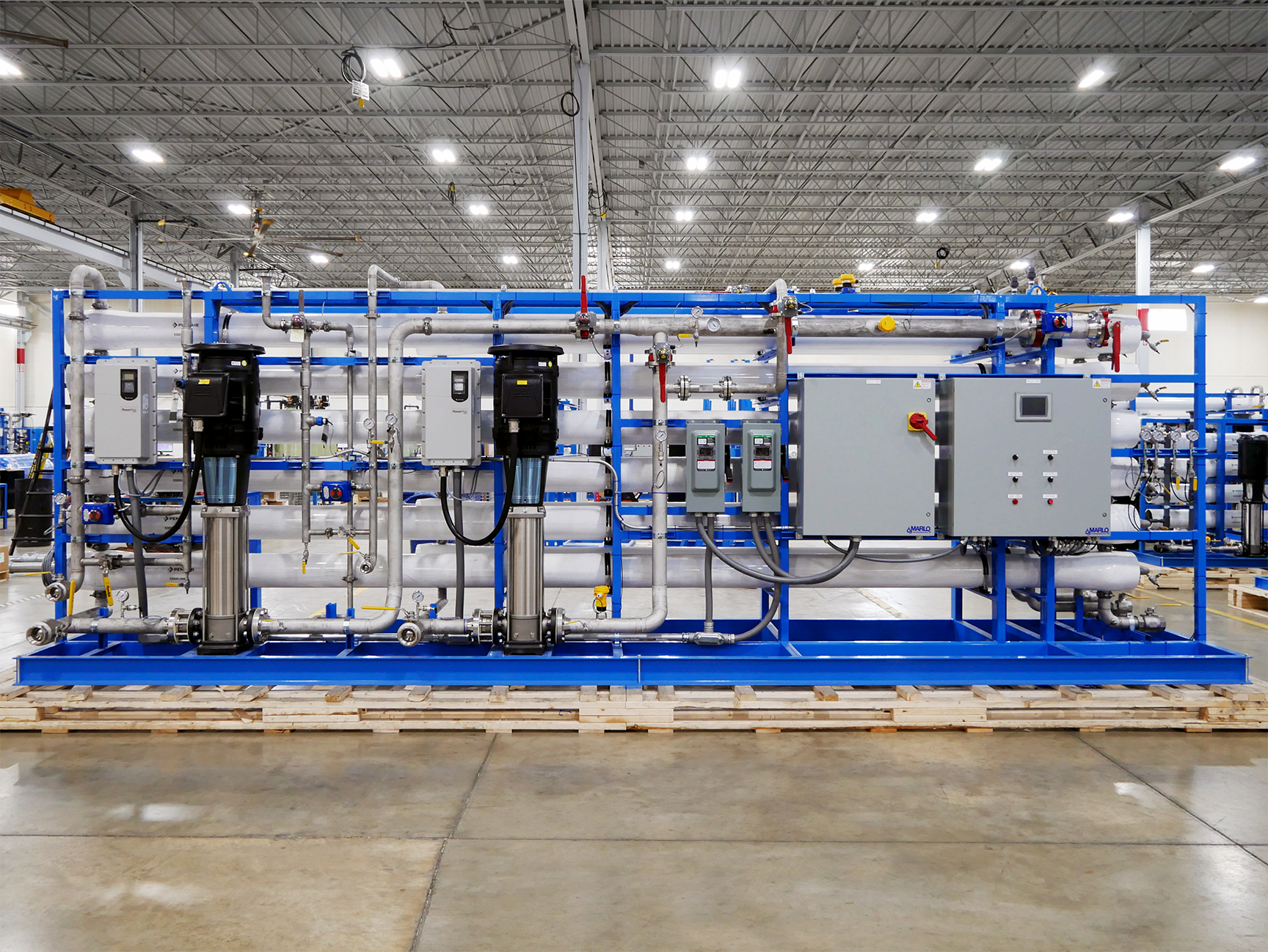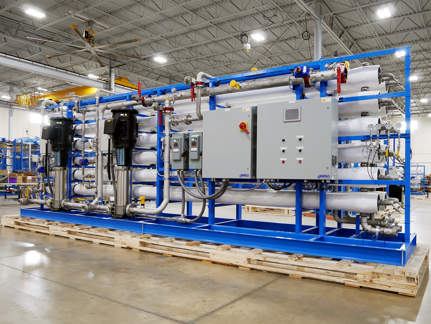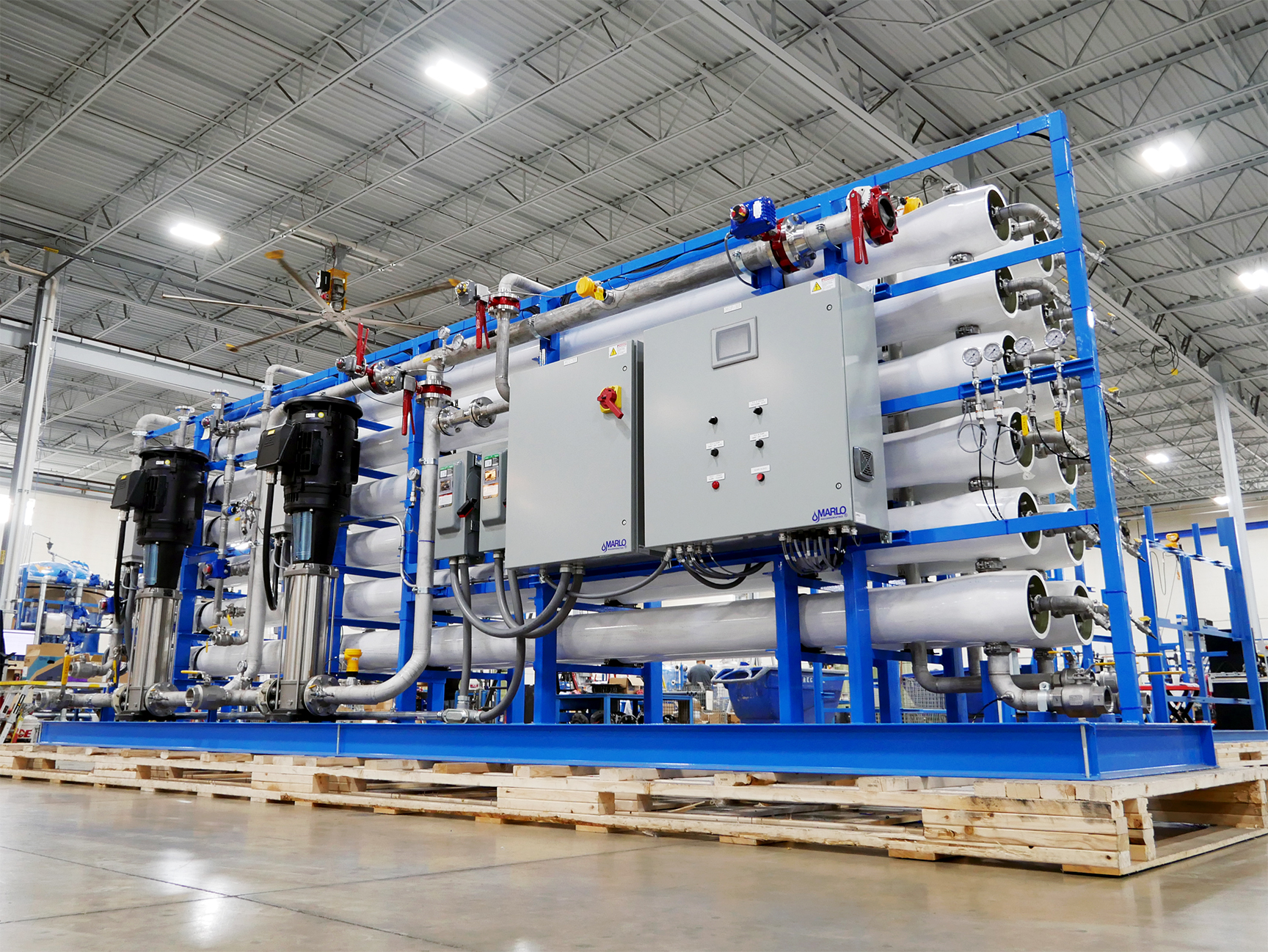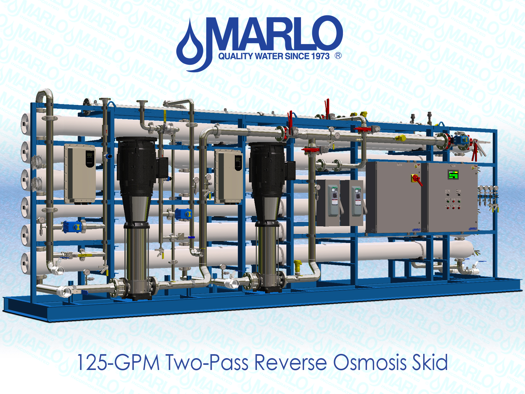 MARLO 125-GPM Two-Pass Reverse Osmosis (RO) Skid to provide highly purified water to feed a final polishing step through Electro-Deionization (EDI) at an electronic device manufacturing facility. Two-Pass designs are essentially two (2) RO systems in series with the final product water going through the membrane twice. The reject water from the 2nd pass is recovered as feed to the 1st pass to improve the overall recovery.