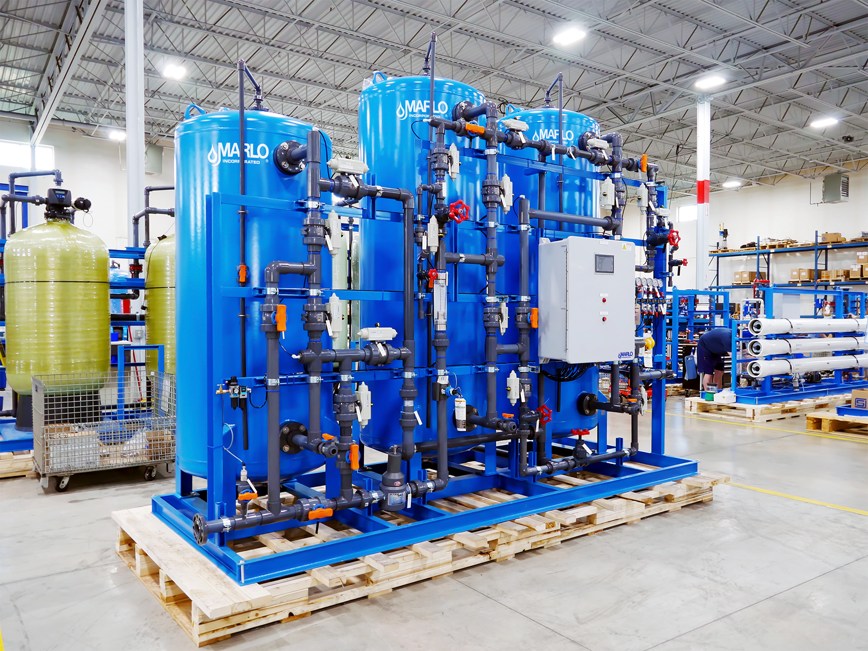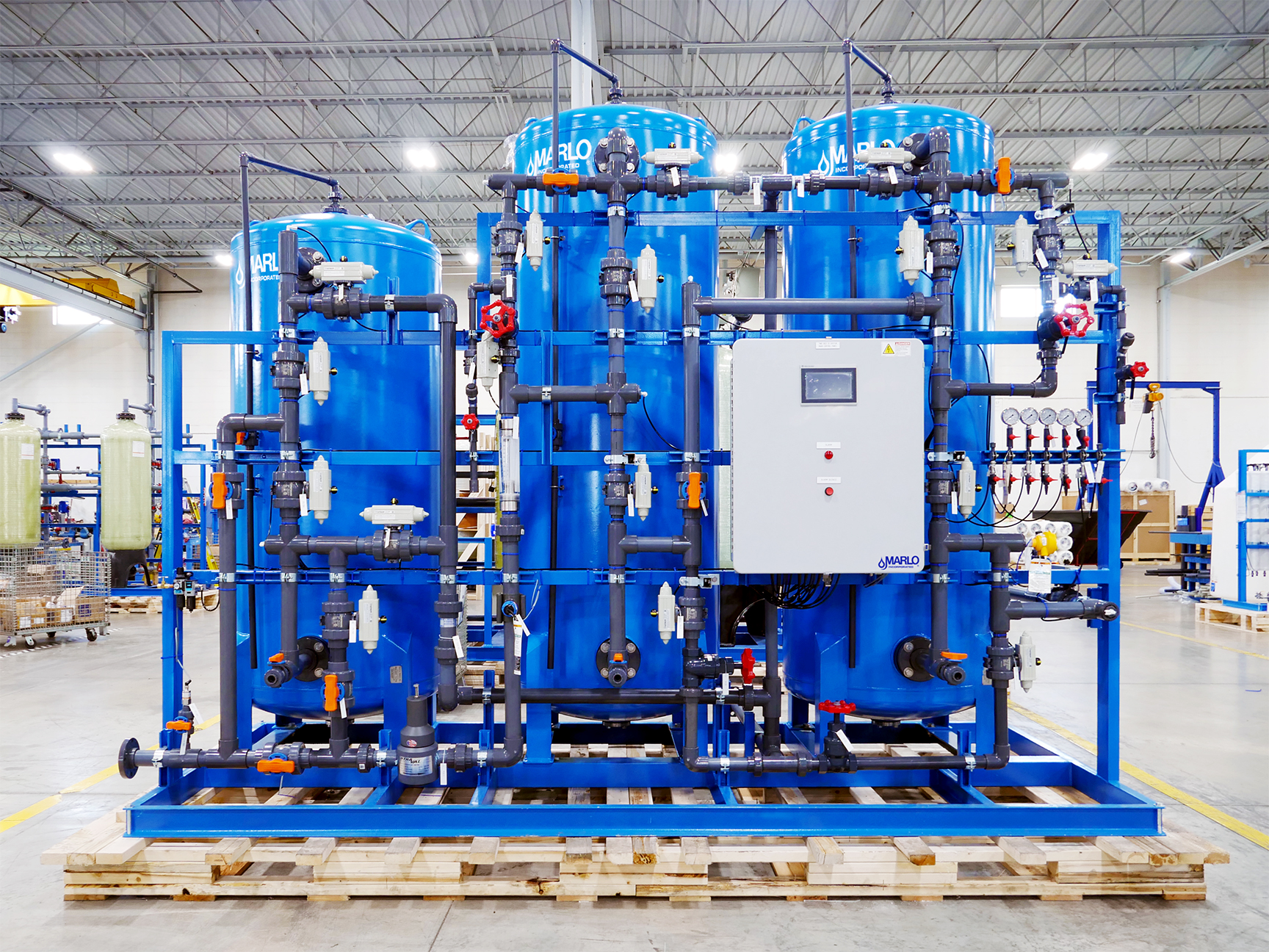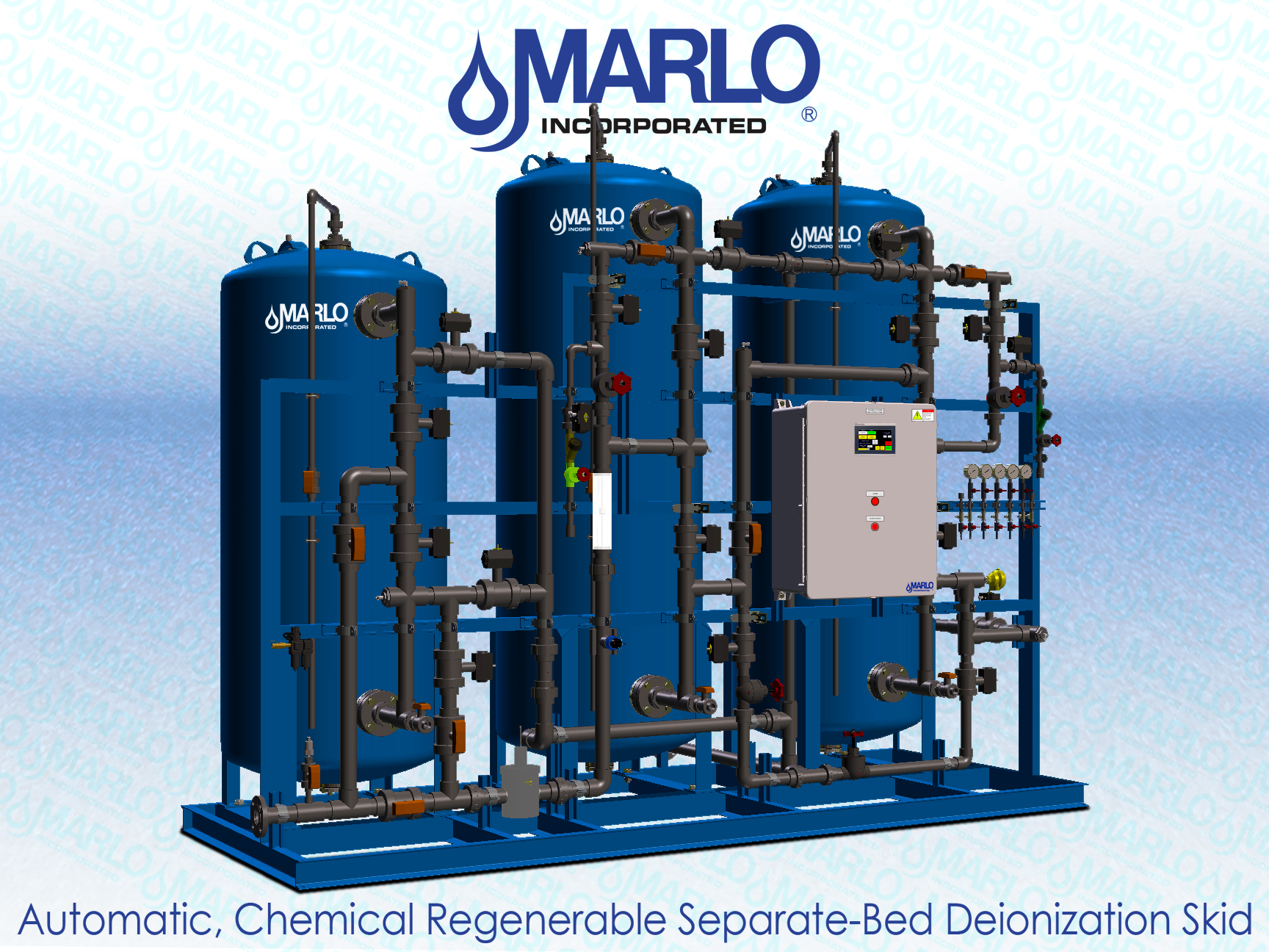 MARLO Automatic, Chemical Regenerable Separate-Bed (Cation/Anion) Deionization Skid with an Activated Carbon Pre-Filter. Built for a Metal Surface Finishing and Plating Facility. Key features include 36” diameter, ASME Code, Vinylester-lined carbon steel pressure vessels, pneumatic-actuated PVC ball-style control valves, Sch 80 PVC pipework, Allen-Bradley PLC/HMI Panel, and fully skid mounted, pre-piped, pre-wired and factory tested.