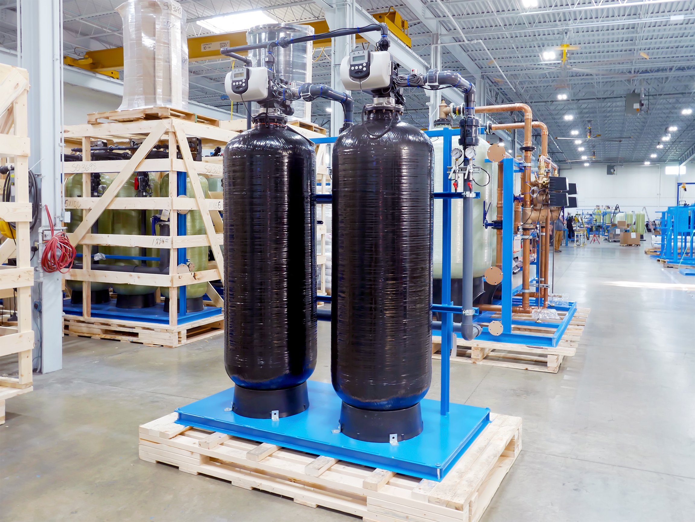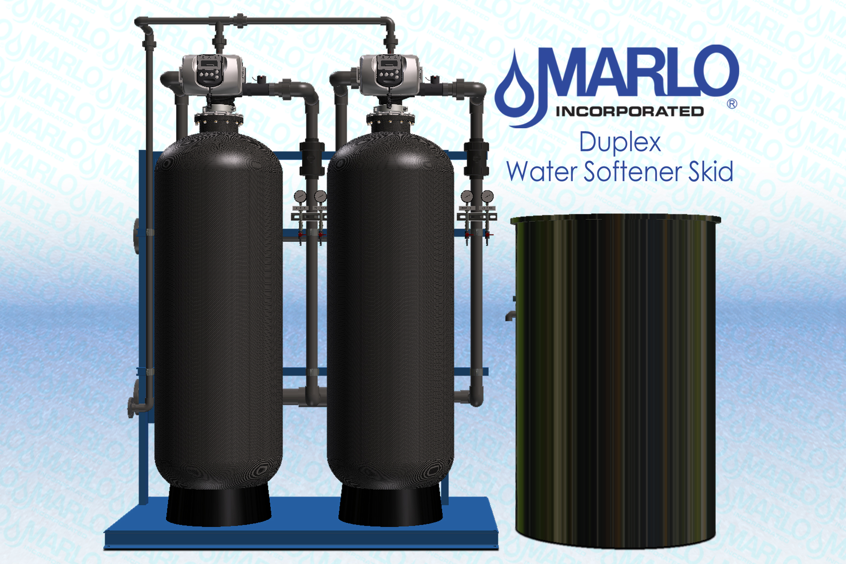 MARLO Duplex Water Softener Skid for supply to the Hot Water side of the plumbing network for a major chain hotel. Key features include 24” diameter FRP resin tanks, 300,000 Grain Capacity per tank, top-mounted 2” Clack WS2HF control valves, and 3” Sch 80 PVC interconnecting piping headers. Progressive flow configuration with 1-2 tanks online based on actual water demand. Fully skid mounted, pre-piped, and factory tested.
