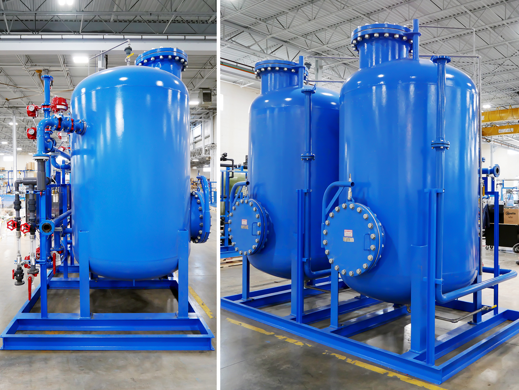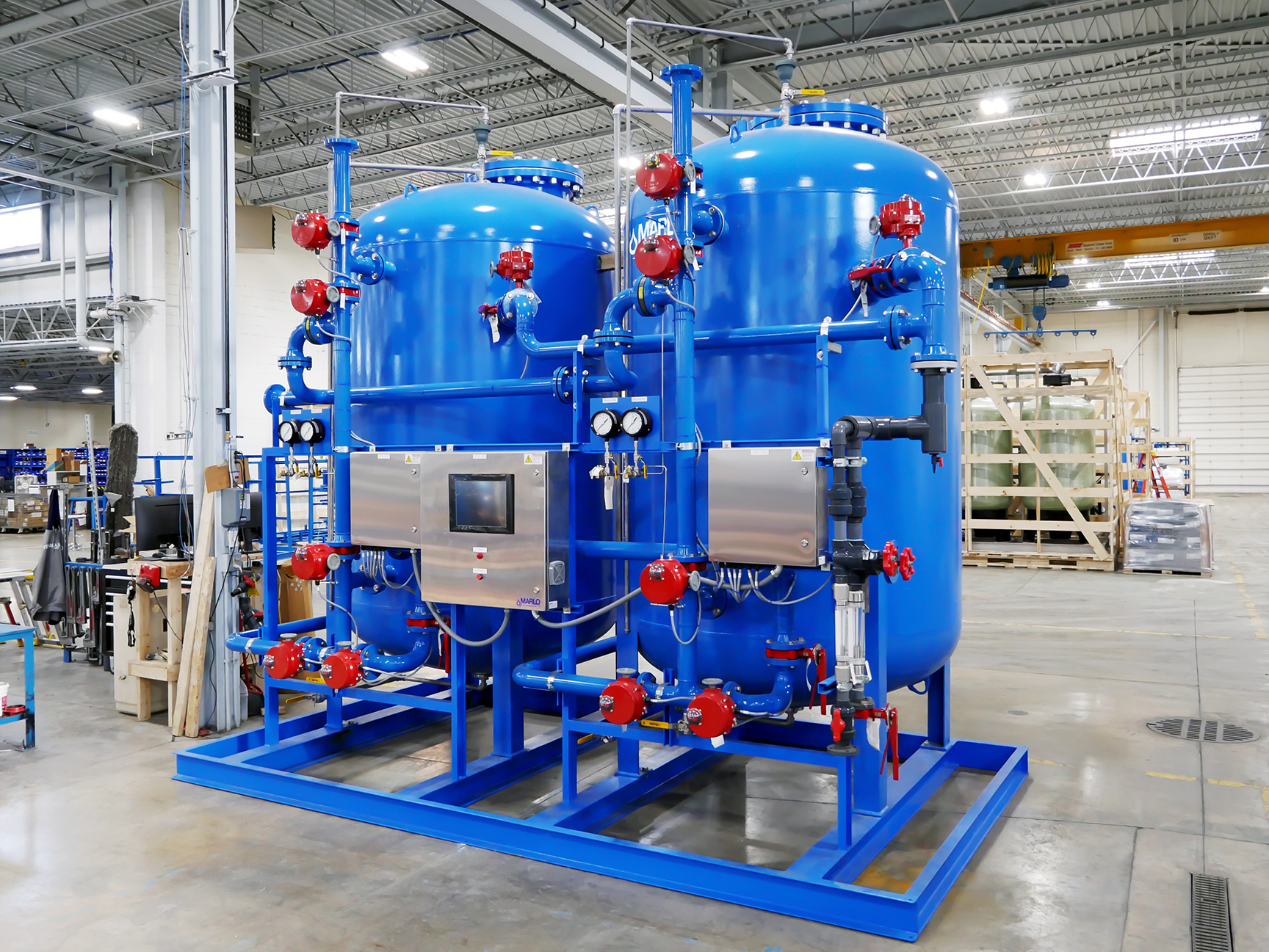 MARLO Duplex Water Softener Skid for the Central Utility Plant (CUP) at a Pulp & Paper Mill. Key features include 72” diameter epoxy-lined, ASME Code Stamped carbon steel pressure vessels, electric-actuated butterfly control valves, welded carbon steel pipework with 4” flanged service headers, and Allen-Bradley CompactLogix PLC/HMI control panel. Alternating flow configuration with 1-Vessel Online/1-Vessel Standby. Fully skid mounted, pre-piped, pre-wired and factory tested. Bulk brinemaker silo and brine pump skid provided but not shown.