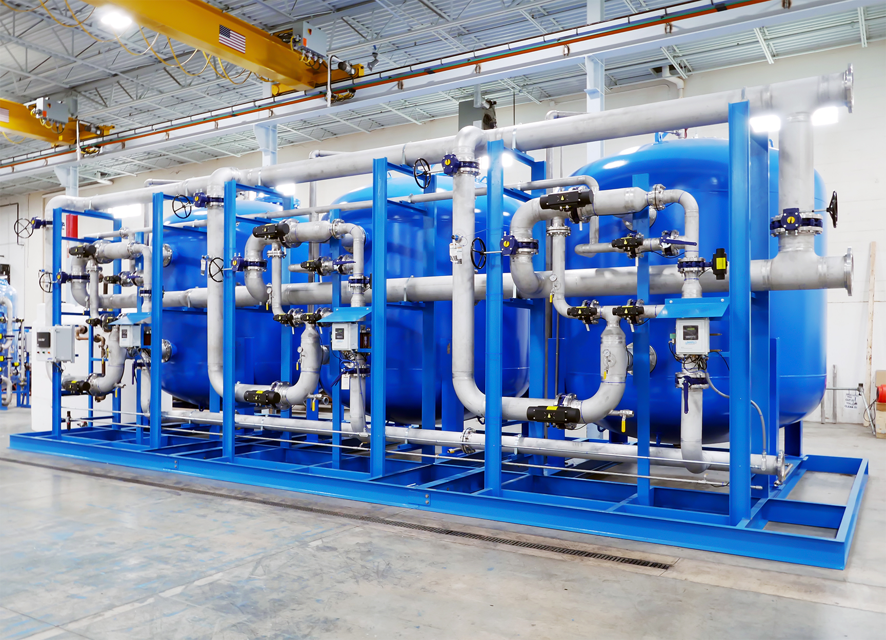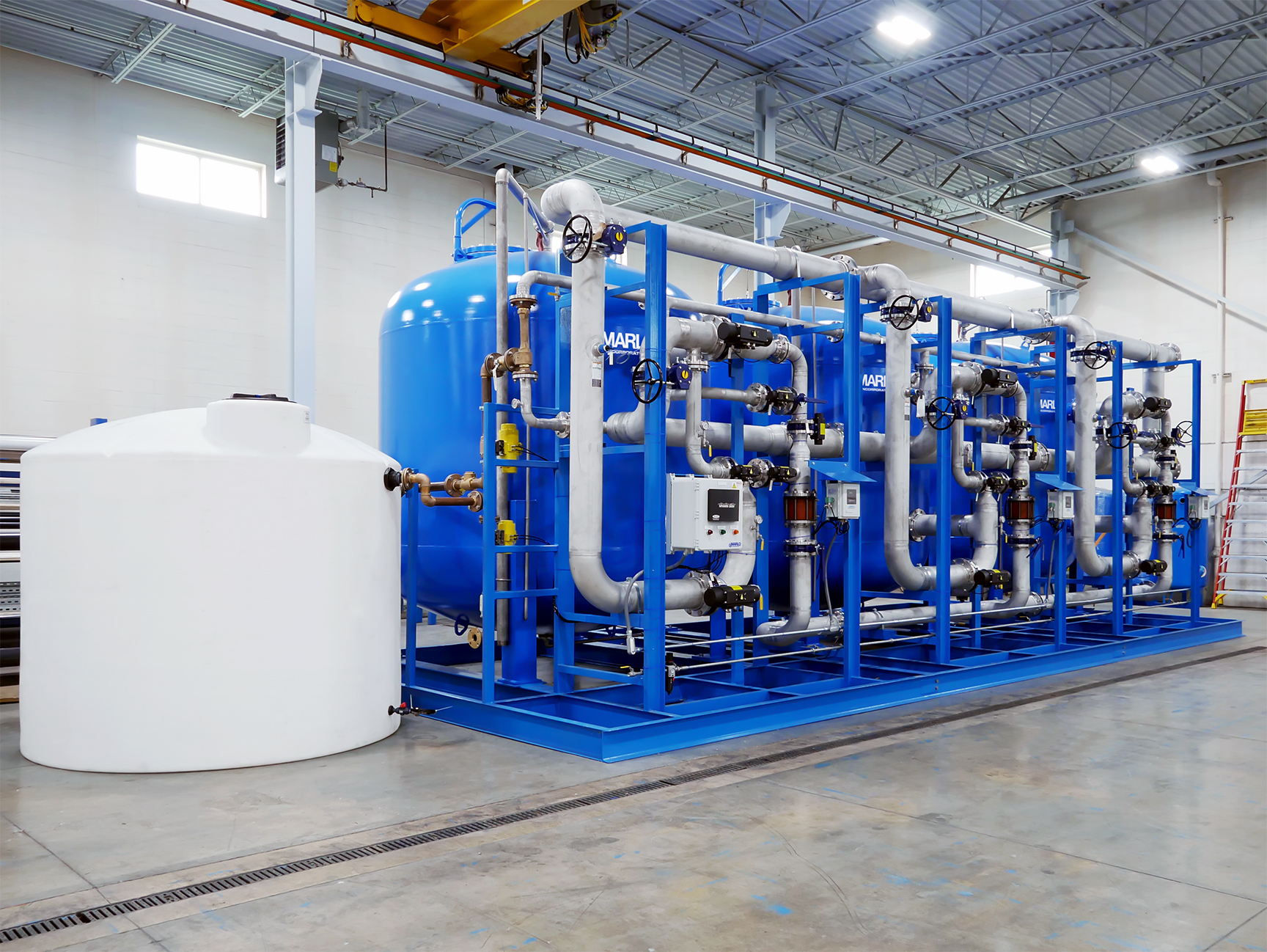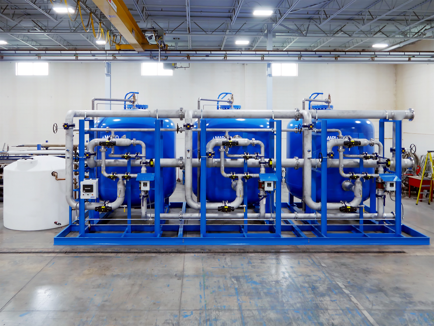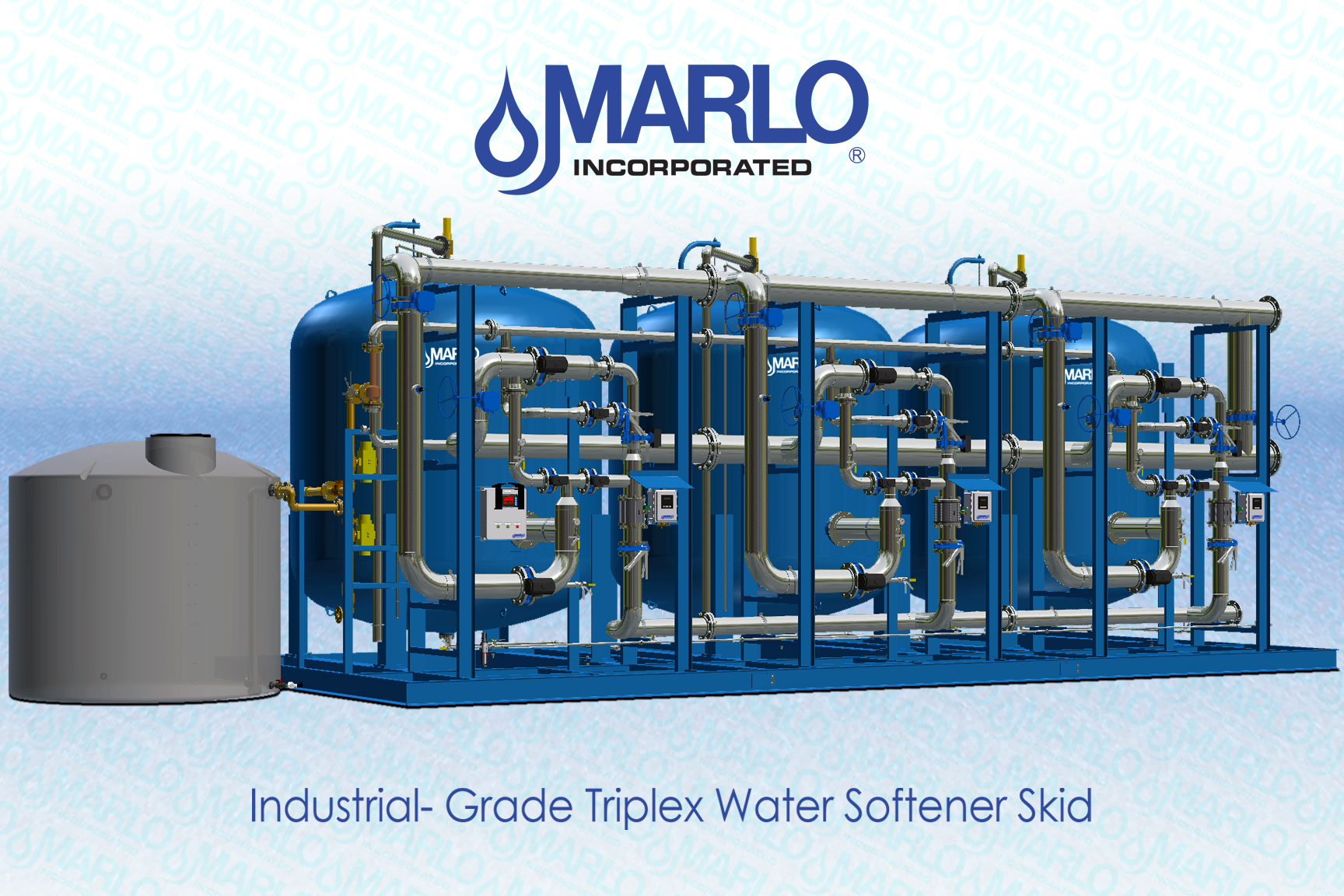MARLO Industrial- Grade, Triplex Water Softener Skid for the Central Utility Plant (CUP) at a Beef Processing Facility. Key features include 120” diameter epoxy-lined, ASME Code Stamped carbon steel pressure vessels, pneumatic-actuated butterfly control valves, welded 304 stainless steel pipework with 10” flanged service headers. All piping is designed per the ASME B31.3 code. Local HMI and I/O control panels provided with the primary PLC processor located in a remote location. Progressive flow configuration with 1-3 tanks online depending on actual water demand. Fully skid mounted, pre-piped, pre-wired and factory tested. The skid can be separated into (3) sections to better facilitate shipping and installation. Designed for an outdoor installation.