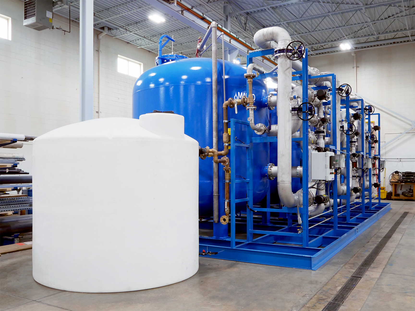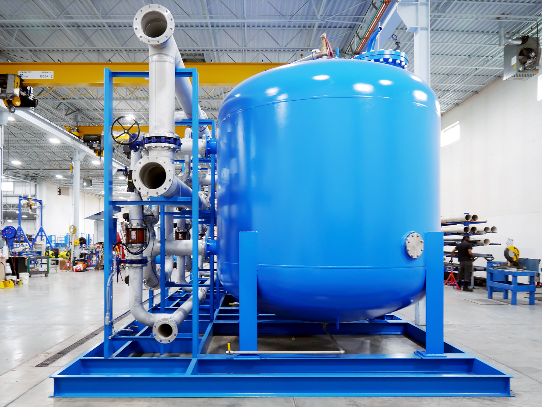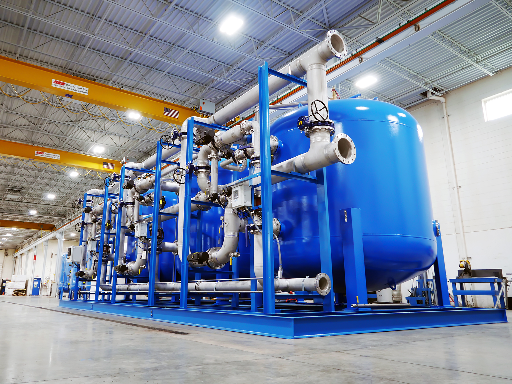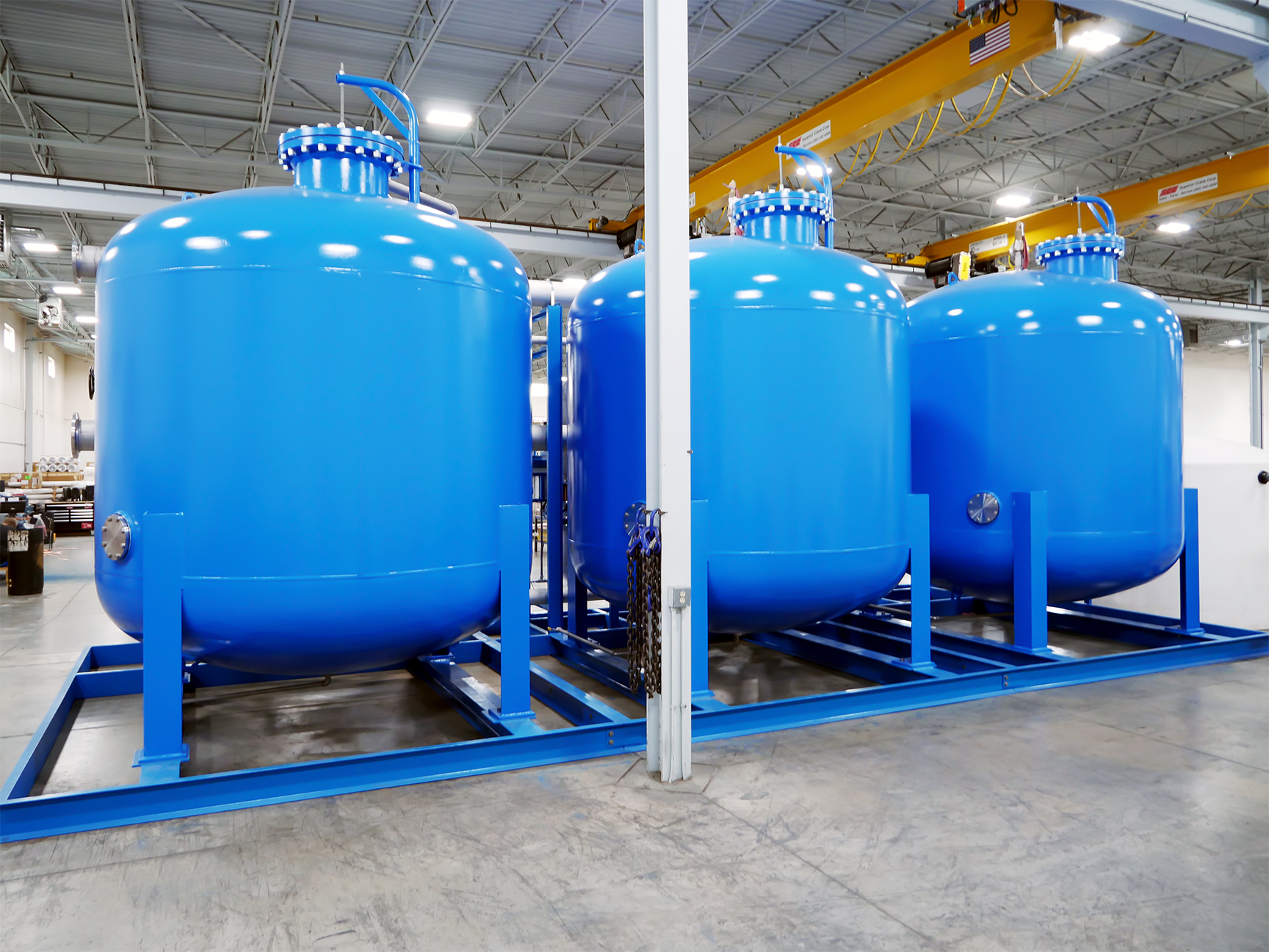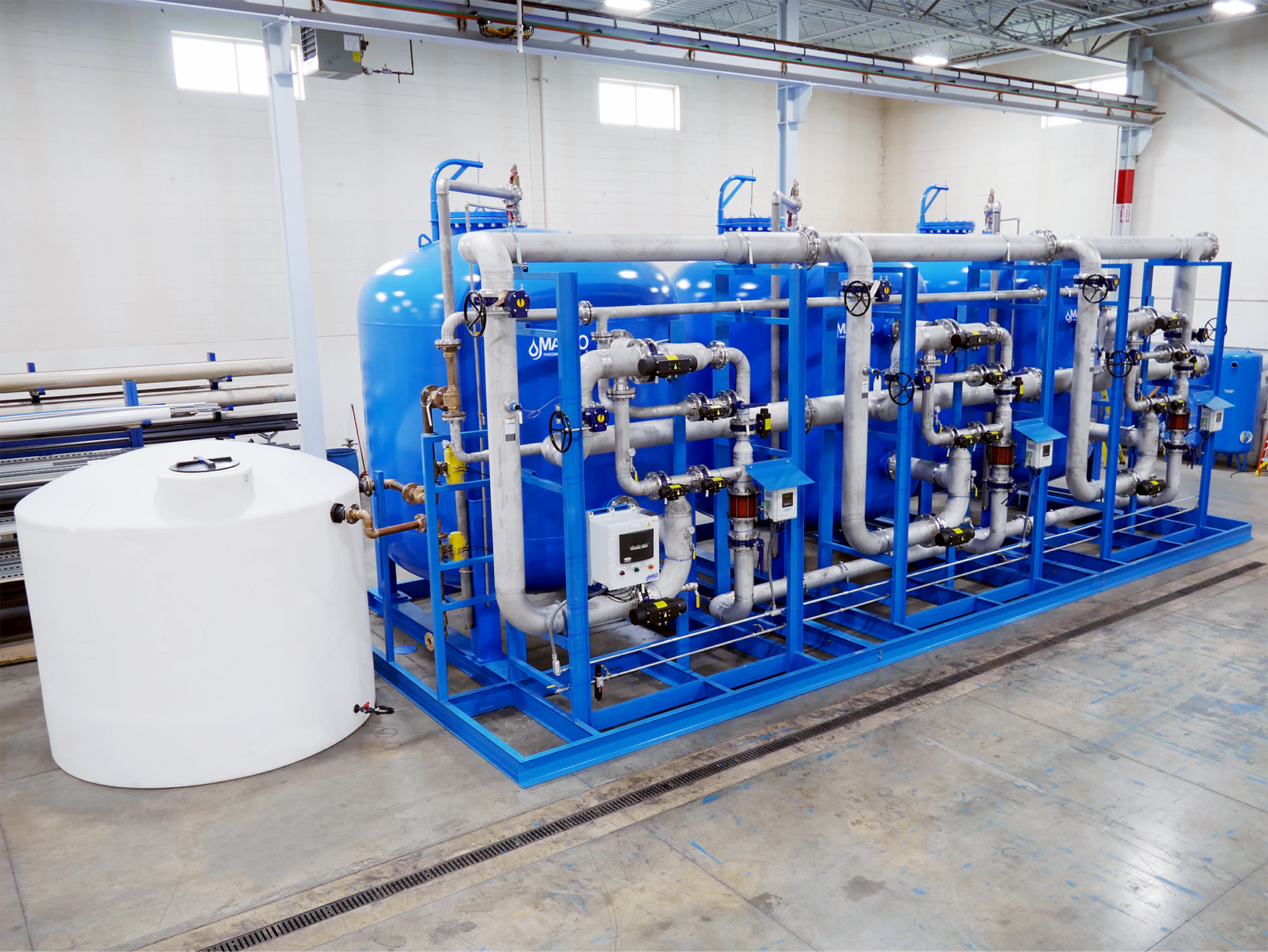 MARLO Industrial- Grade, Triplex Water Softener Skid for the Central Utility Plant (CUP) at a Beef Processing Facility. Key features include 120” diameter epoxy-lined, ASME Code Stamped carbon steel pressure vessels, pneumatic-actuated butterfly control valves, welded 304 stainless steel pipework with 10” flanged service headers. All piping is designed per the ASME B31.3 code. Local HMI and I/O control panels provided with the primary PLC processor located in a remote location. Progressive flow configuration with 1-3 tanks online depending on actual water demand. Fully skid mounted, pre-piped, pre-wired and factory tested. The skid can be separated into (3) sections to better facilitate shipping and installation. Designed for an outdoor installation.