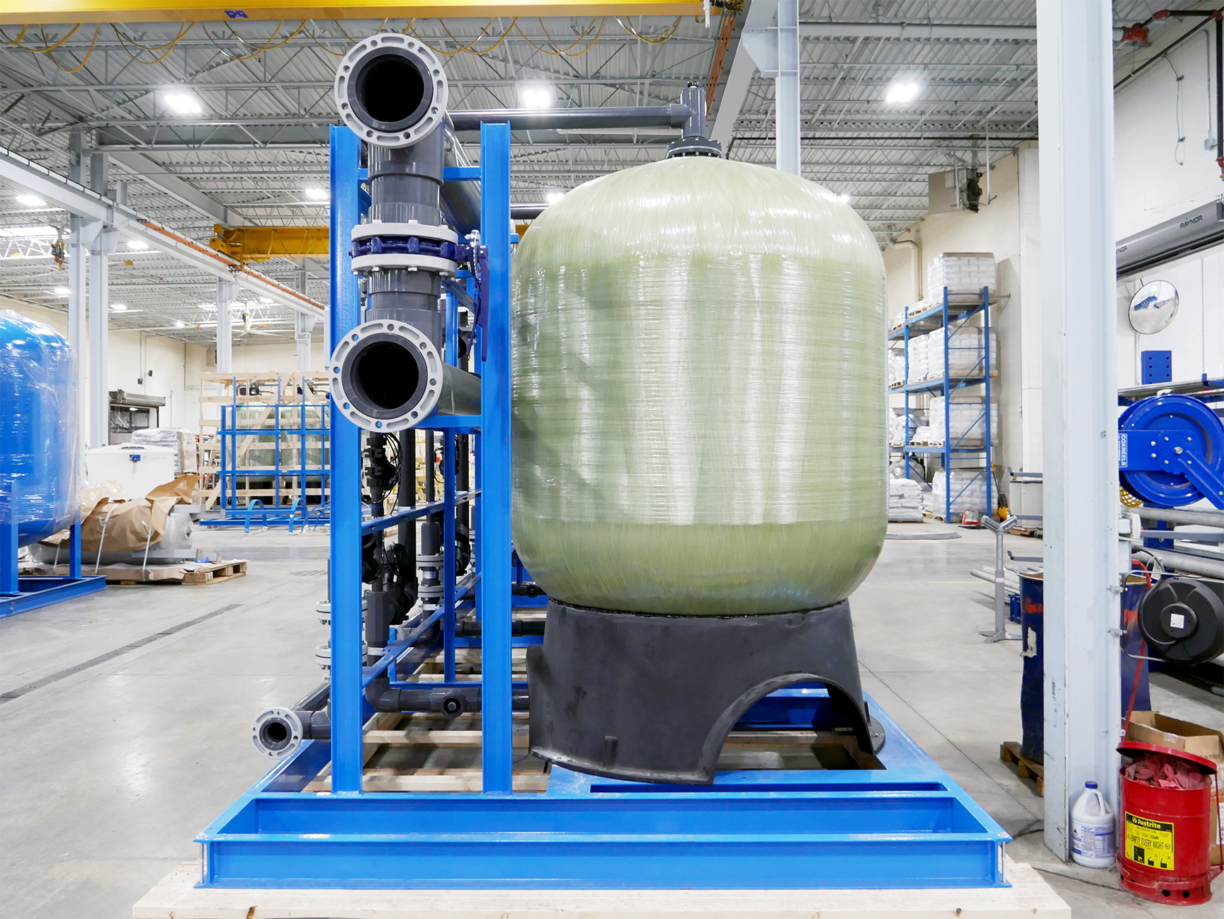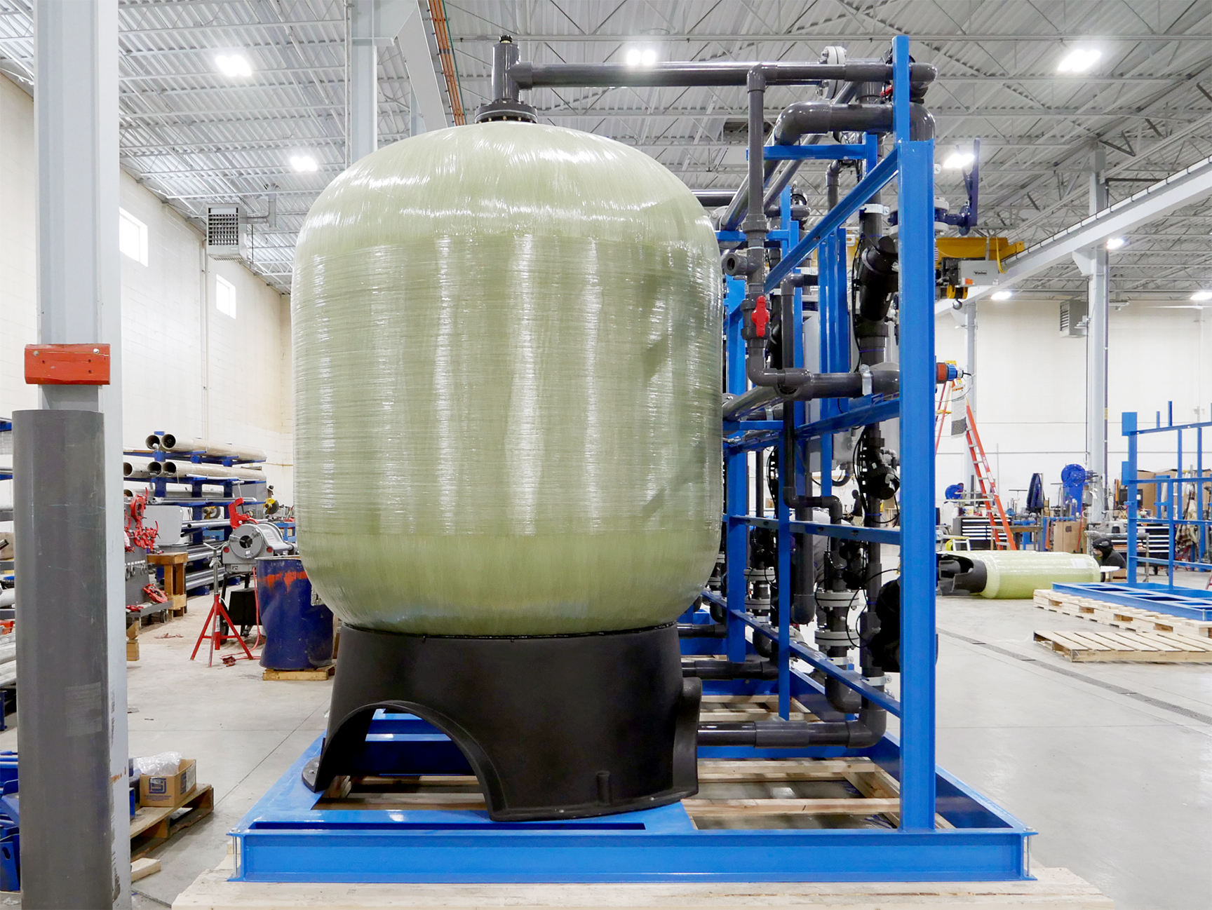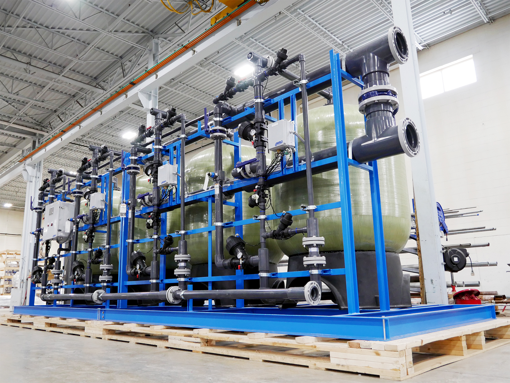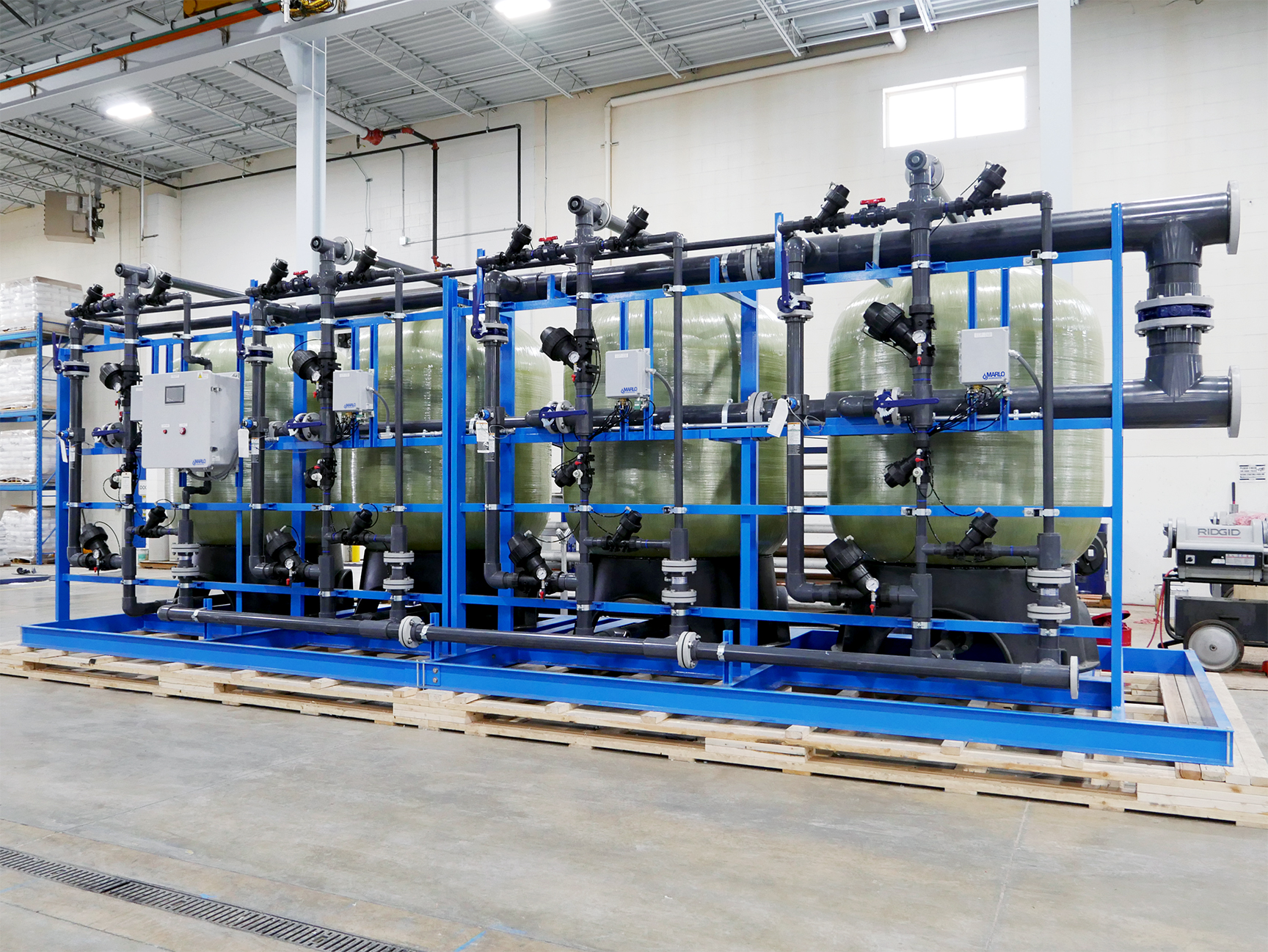 MARLO Quadraplex Water Softener System for an Electric-Vehicle (EV) Battery Production Plant. Key features include 63” Diameter, FRP ASME Code pressure vessels, AQ-MATIC diaphragm control valves, Sch 80 PVC pipework, Carbon Steel Skid/Frame assembly, and an Allen-Bradley PLC/HMI control system. Progressive flow configuration with 1-4 tanks online depending on actual water demand. Fully skid mounted, pre-piped, pre-wired and factory tested. The skid can be separated into (2) sections to better facilitate shipping and installation. Bulk brinemaker silo and brine pump skid provided but not shown.