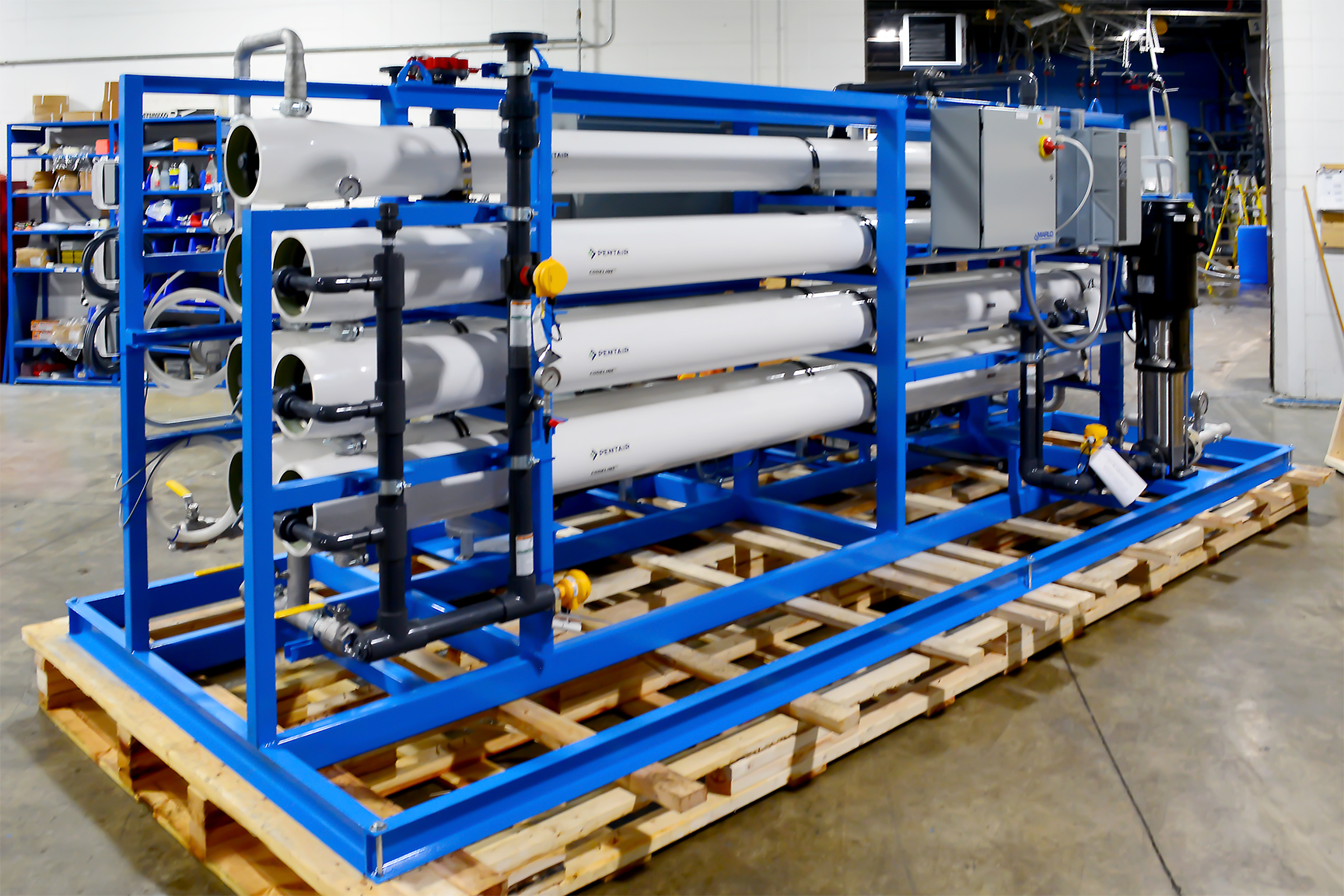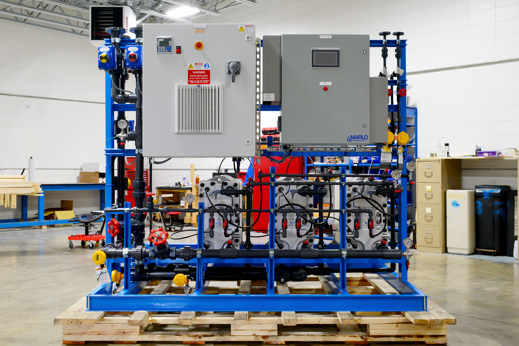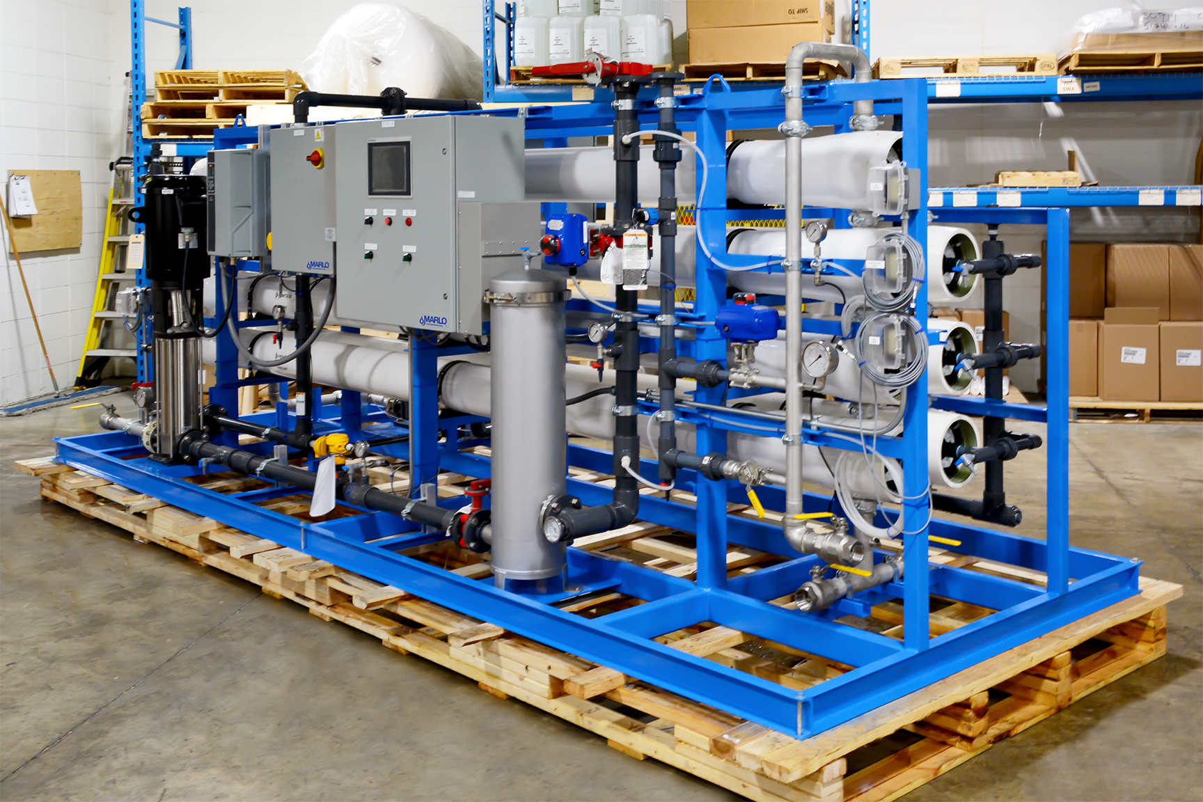 MARLO Industrial-Grade, Reverse Osmosis (RO) /Electrodeionization (EDI) Water Treatment System for On-Site Power Generation at a Sugar Processing Facility. The RO skid is a Two-Pass Design feeding the EDI skid with a final product flow of 75-GPM. Key features include Grundfos high pressure pumps with Variable Frequency Drives, Allen-Bradley CompactLogix PLC/HMI, and Signet instrumentation package. Fully Skid Mounted, Pre-Piped, Pre-Wired and Factory Tested.
