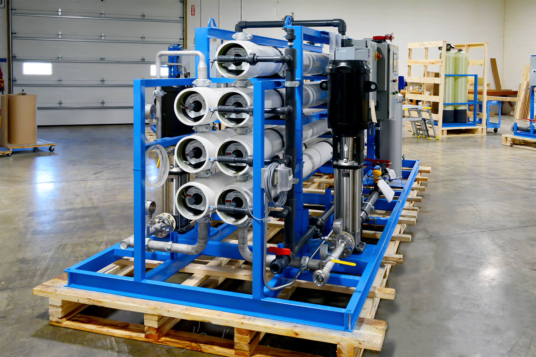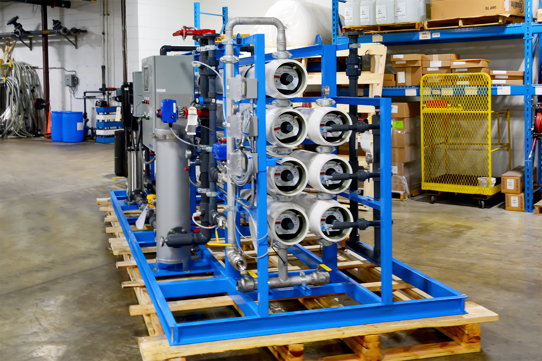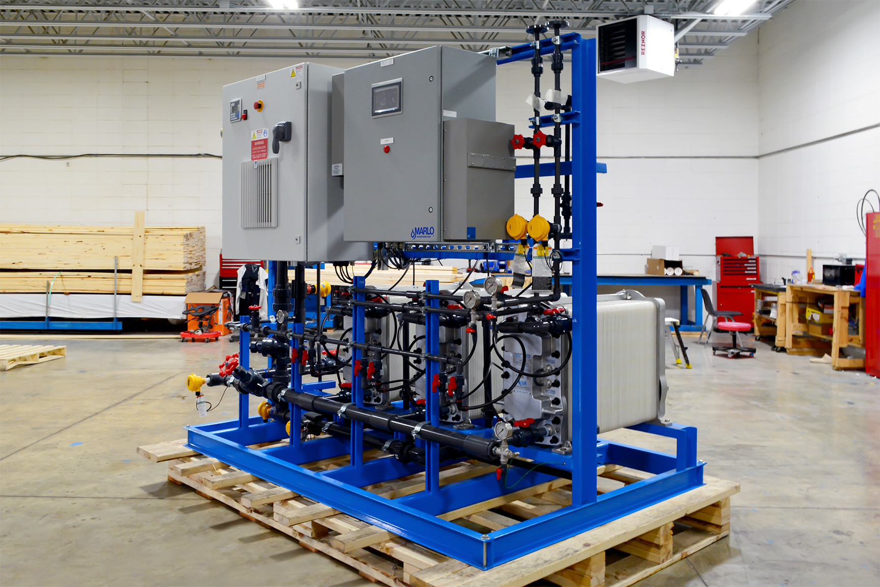 MARLO Industrial-Grade, Reverse Osmosis (RO) /Electrodeionization (EDI) Water Treatment System for On-Site Power Generation at a Sugar Processing Facility. The RO skid is a Two-Pass Design feeding the EDI skid with a final product flow of 75-GPM. Key features include Grundfos high pressure pumps with Variable Frequency Drives, Allen-Bradley CompactLogix PLC/HMI, and Signet instrumentation package. Fully Skid Mounted, Pre-Piped, Pre-Wired and Factory Tested.