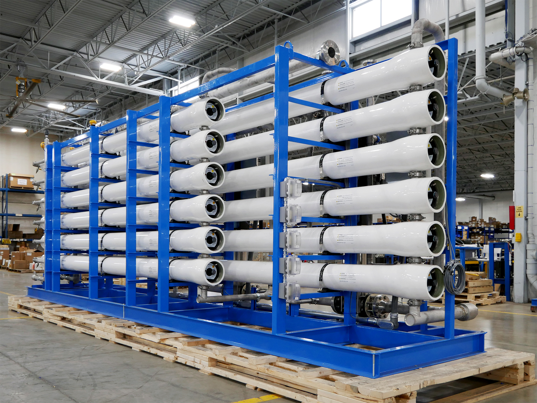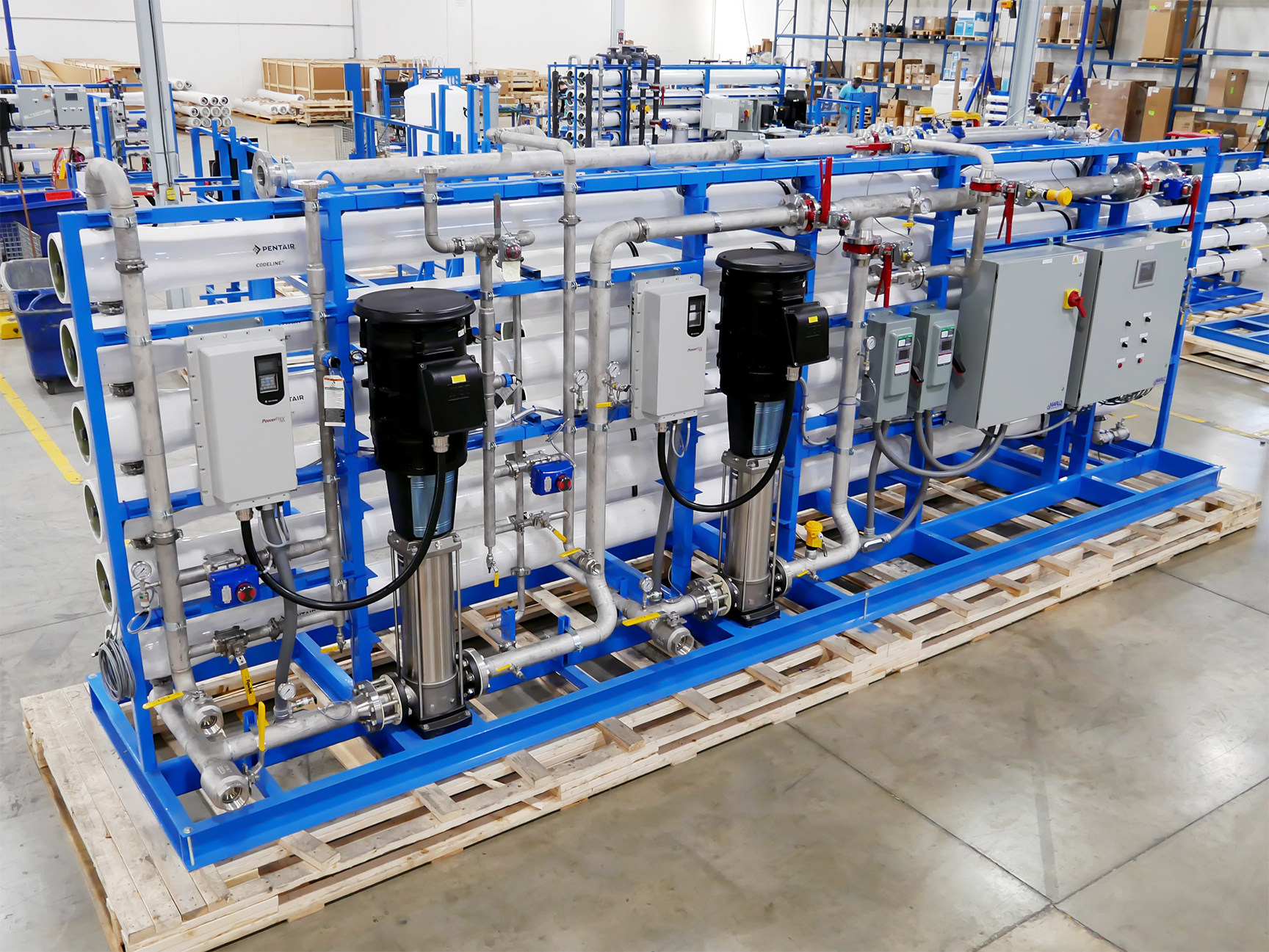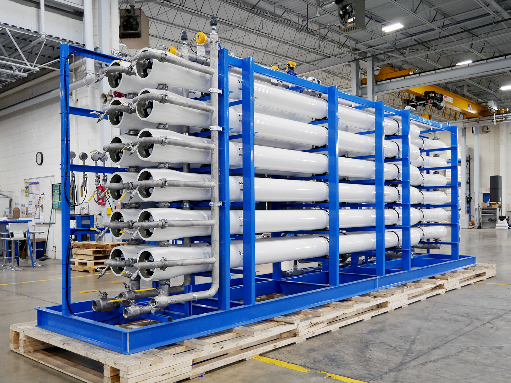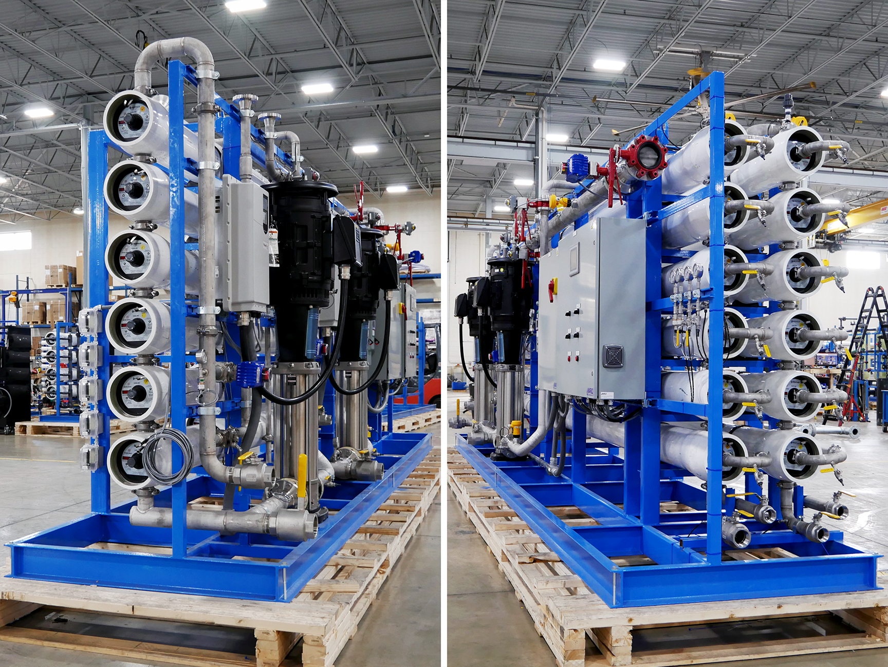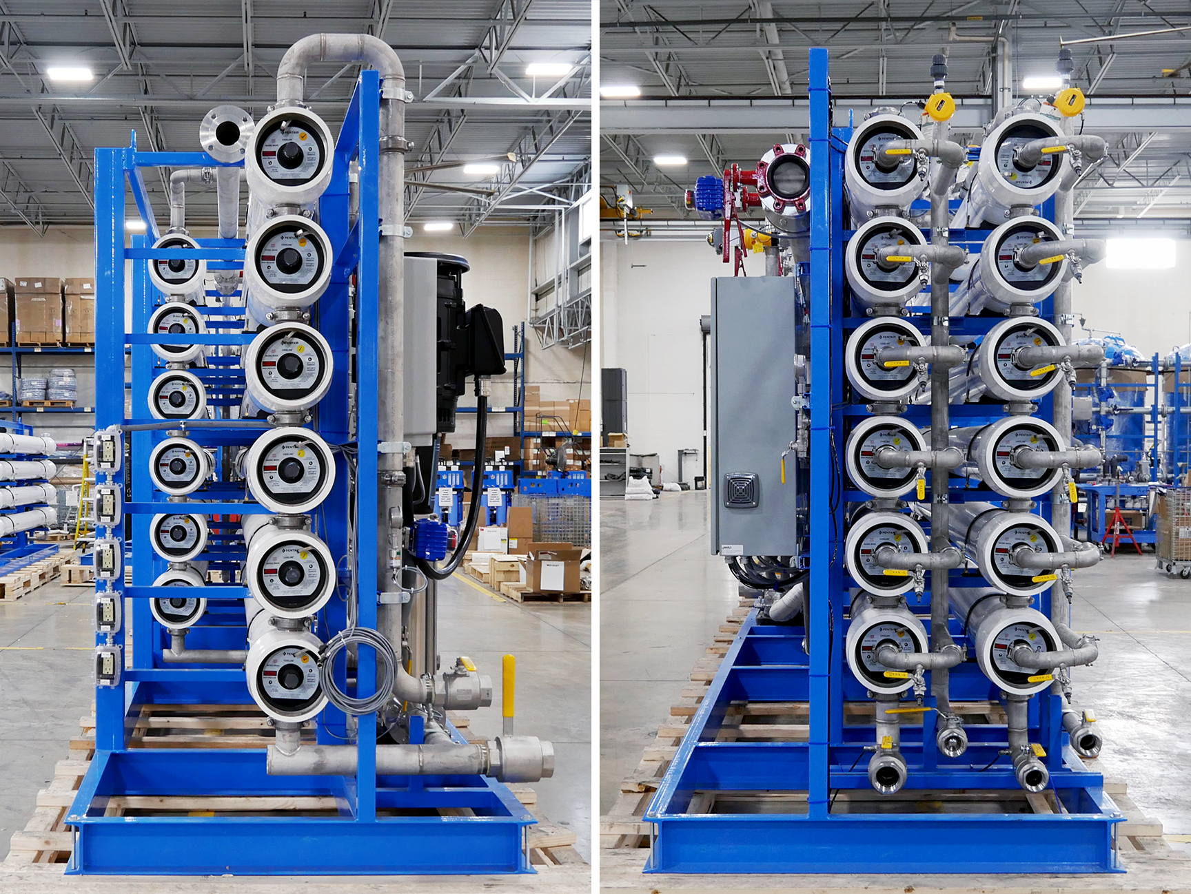 MARLO 125-GPM Two-Pass Reverse Osmosis (RO) Skid to provide highly purified water to feed a final polishing step through Electro-Deionization (EDI) at an electronic device manufacturing facility. Two-Pass designs are essentially two (2) RO systems in series with the final product water going through the membrane twice. The reject water from the 2nd pass is recovered as feed to the 1st pass to improve the overall recovery.