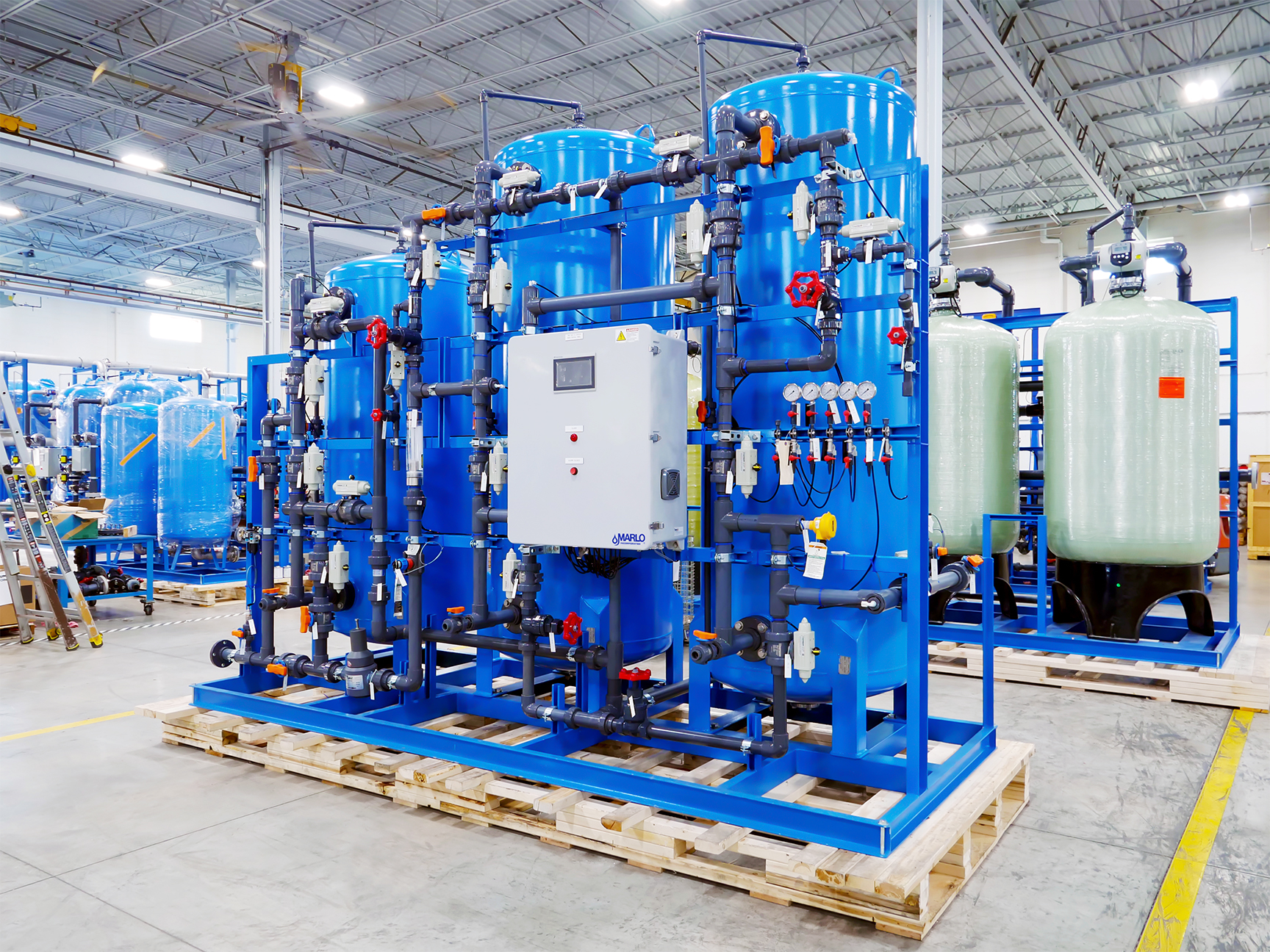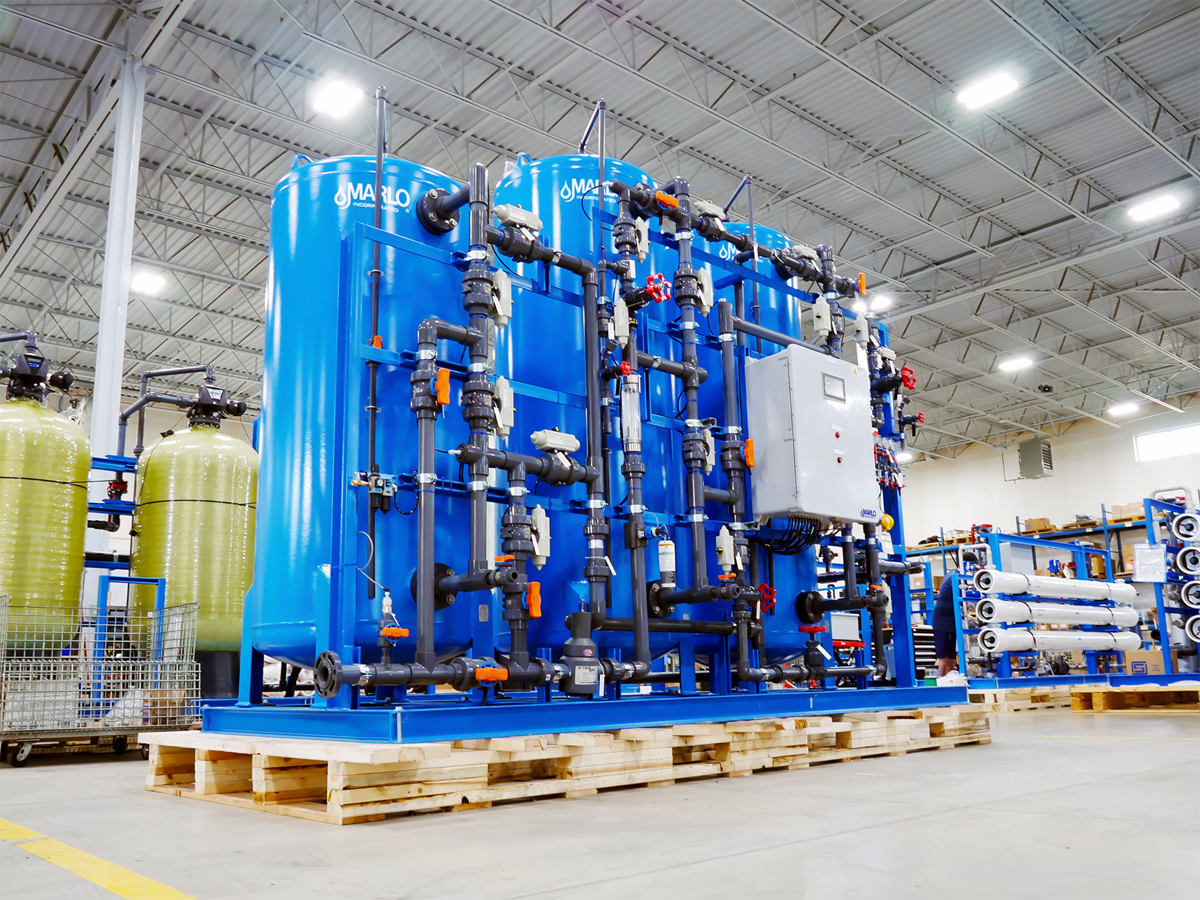 MARLO Automatic, Chemical Regenerable Separate-Bed (Cation/Anion) Deionization Skid with an Activated Carbon Pre-Filter. Built for a Metal Surface Finishing and Plating Facility. Key features include 36” diameter, ASME Code, Vinylester-lined carbon steel pressure vessels, pneumatic-actuated PVC ball-style control valves, Sch 80 PVC pipework, Allen-Bradley PLC/HMI Panel, and fully skid mounted, pre-piped, pre-wired and factory tested.