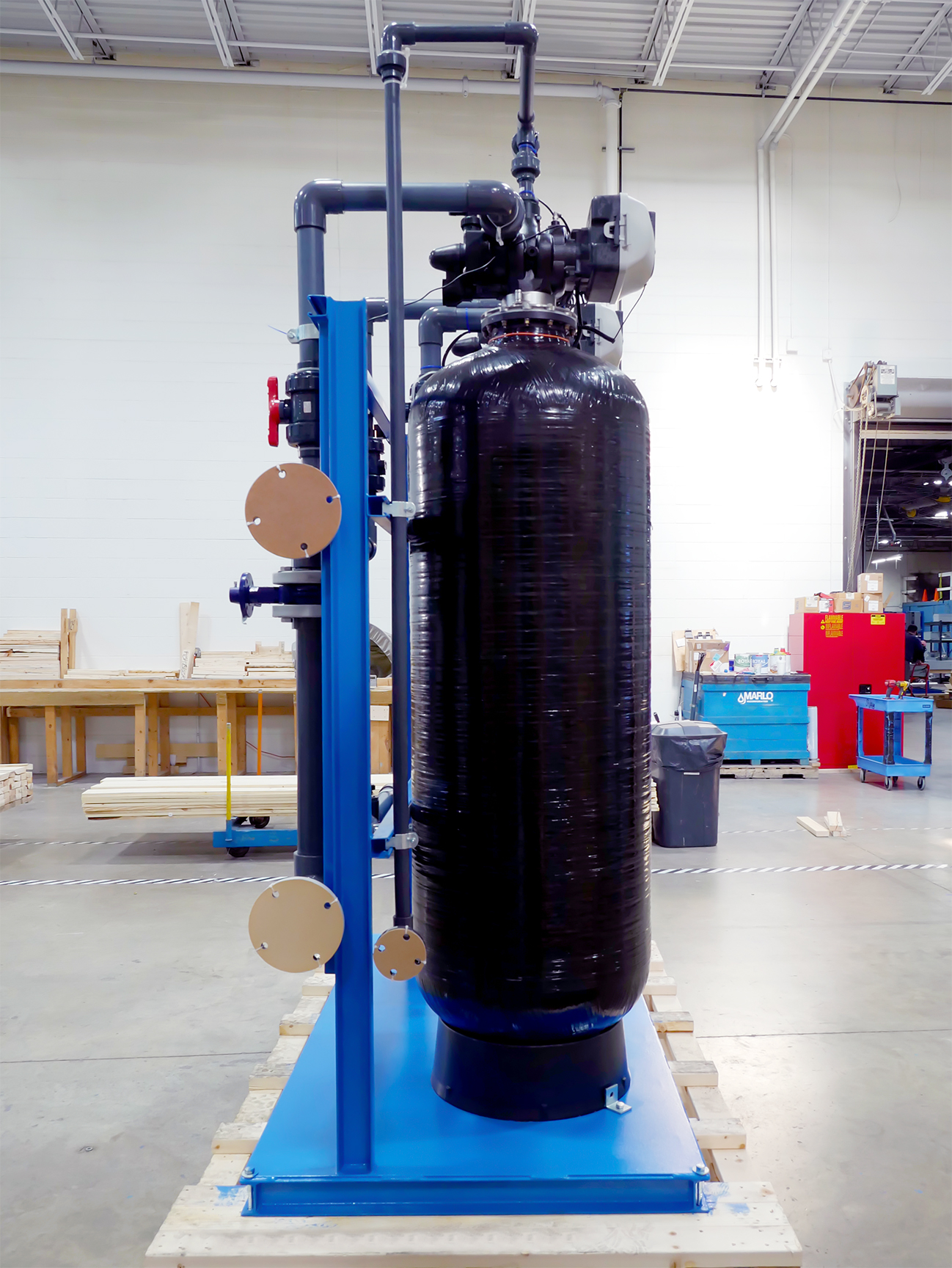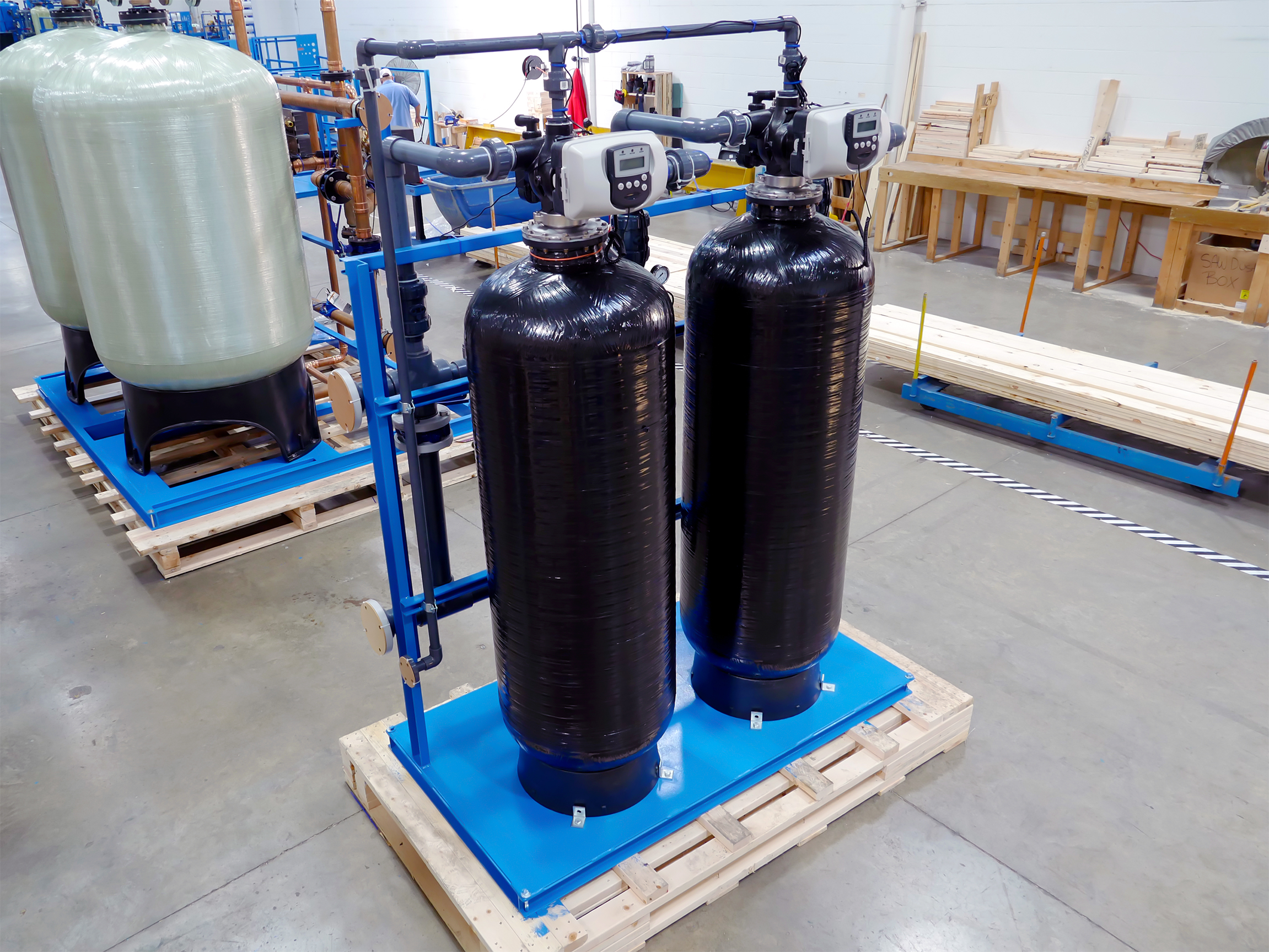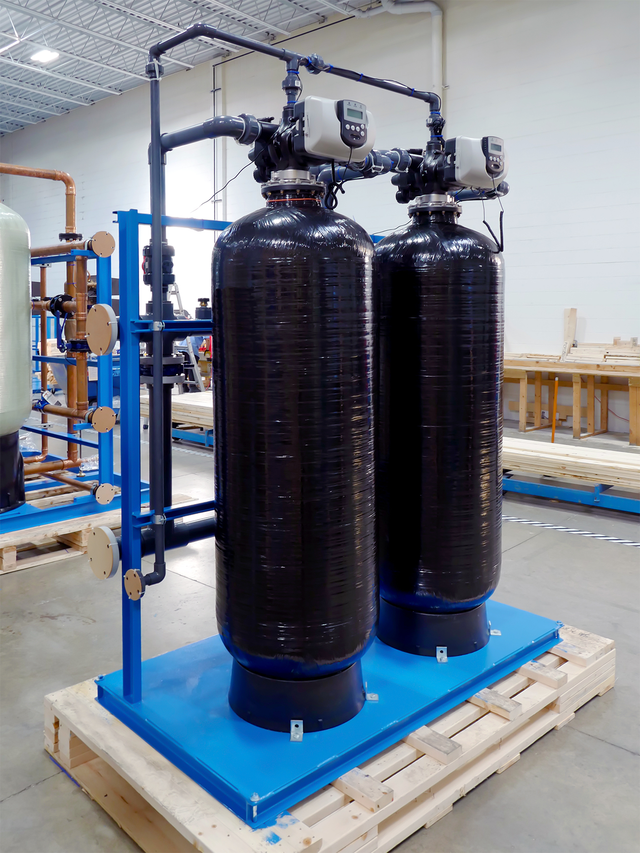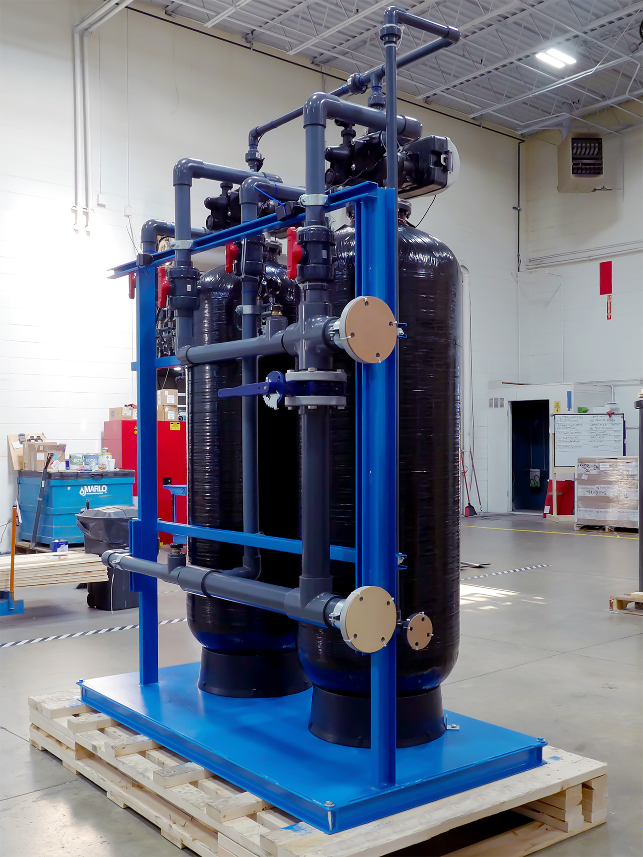 MARLO Duplex Water Softener Skid for supply to the Hot Water side of the plumbing network for a major chain hotel. Key features include 24” diameter FRP resin tanks, 300,000 Grain Capacity per tank, top-mounted 2” Clack WS2HF control valves, and 3” Sch 80 PVC interconnecting piping headers. Progressive flow configuration with 1-2 tanks online based on actual water demand. Fully skid mounted, pre-piped, and factory tested.