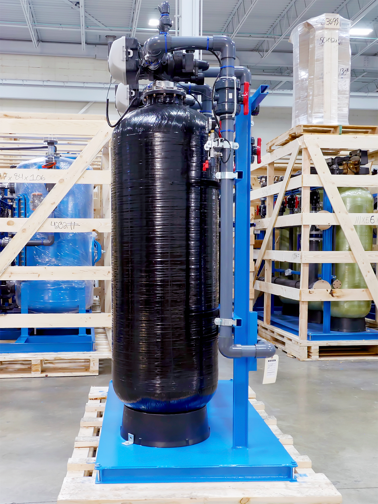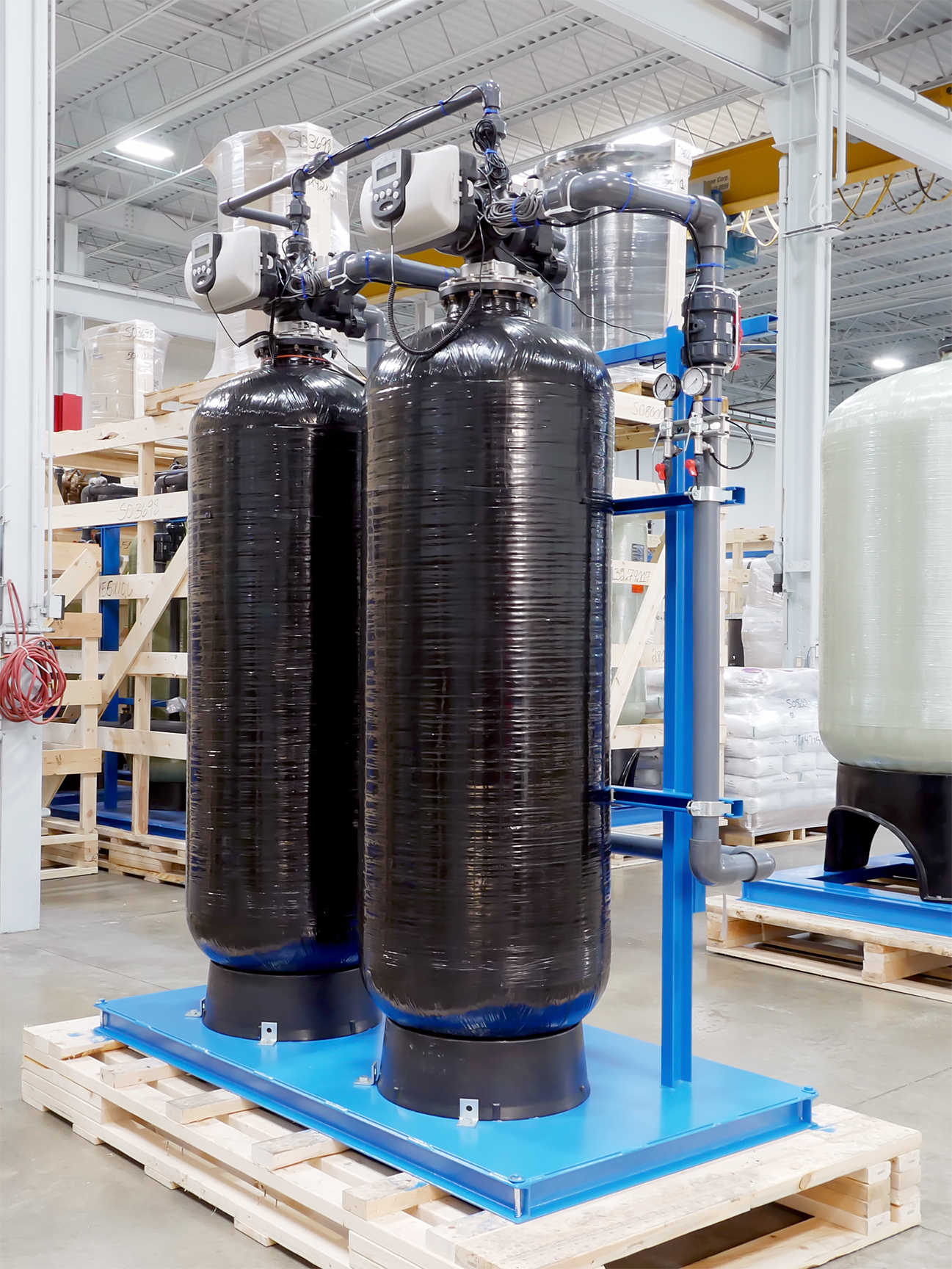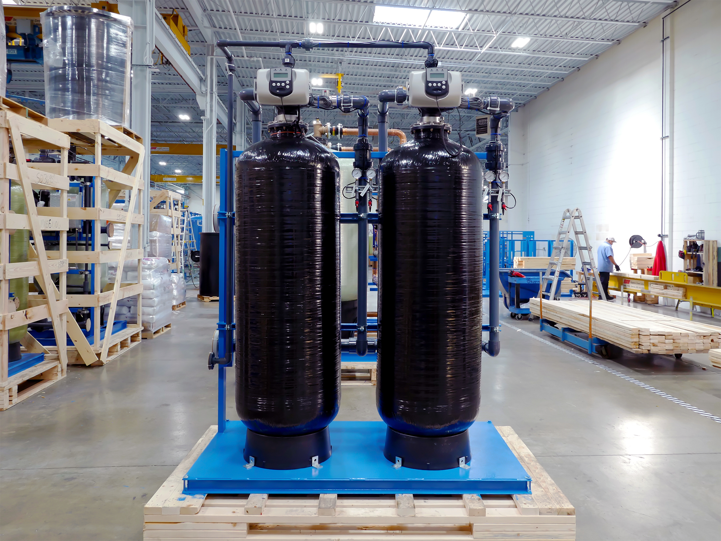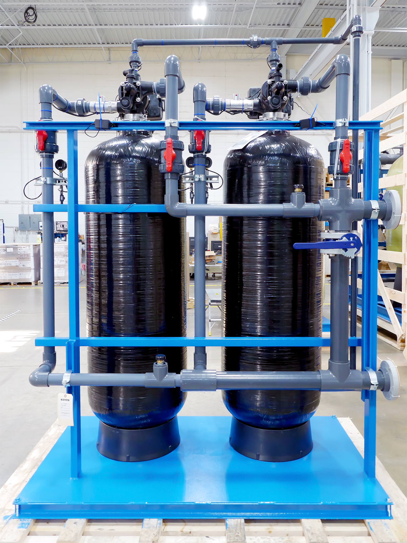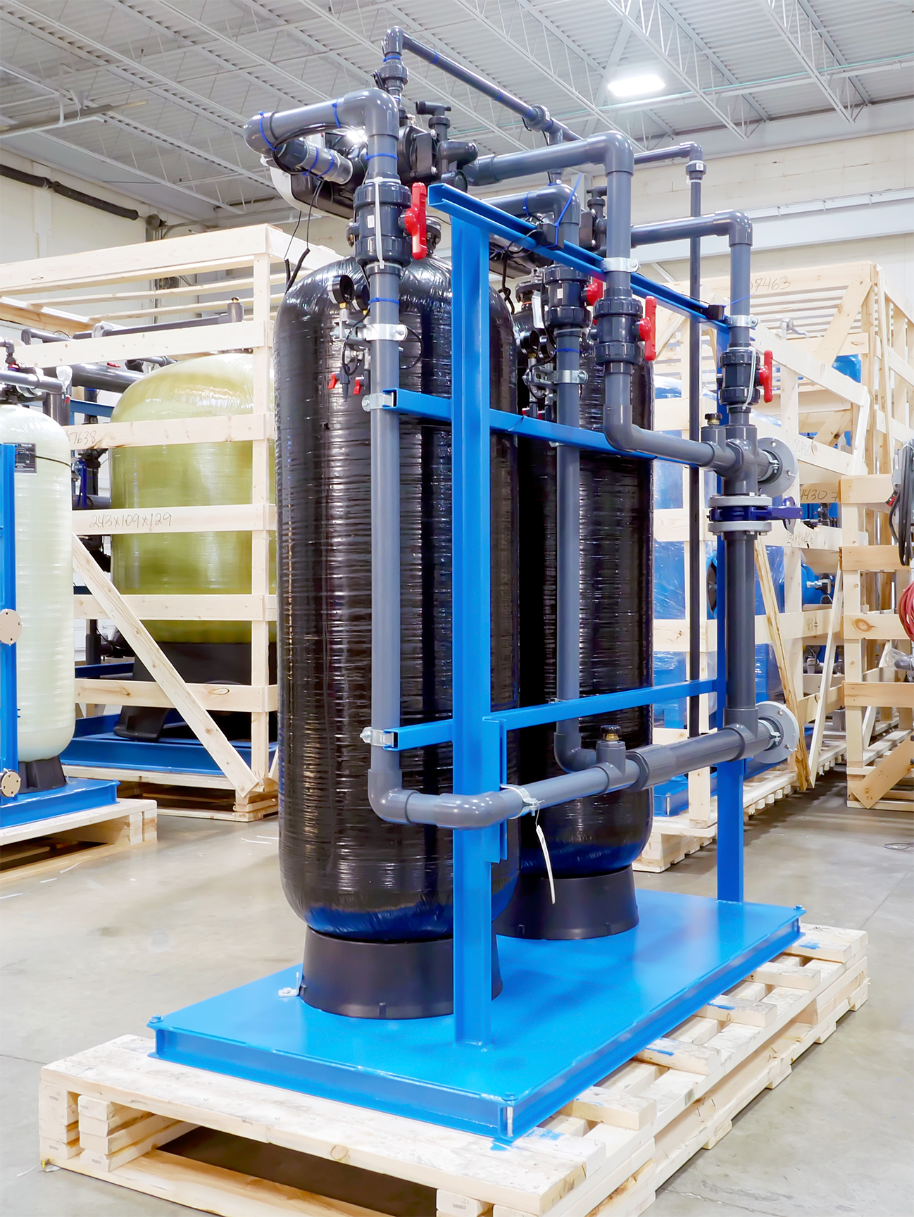 MARLO Duplex Water Softener Skid for supply to the Hot Water side of the plumbing network for a major chain hotel. Key features include 24” diameter FRP resin tanks, 300,000 Grain Capacity per tank, top-mounted 2” Clack WS2HF control valves, and 3” Sch 80 PVC interconnecting piping headers. Progressive flow configuration with 1-2 tanks online based on actual water demand. Fully skid mounted, pre-piped, and factory tested.
