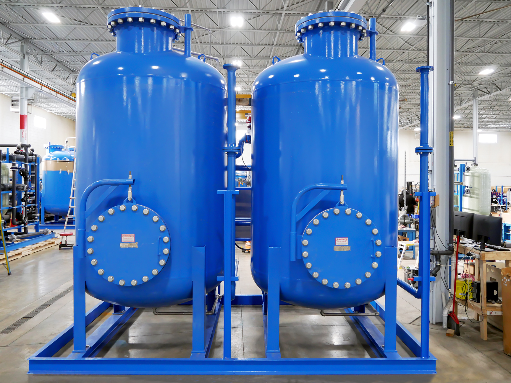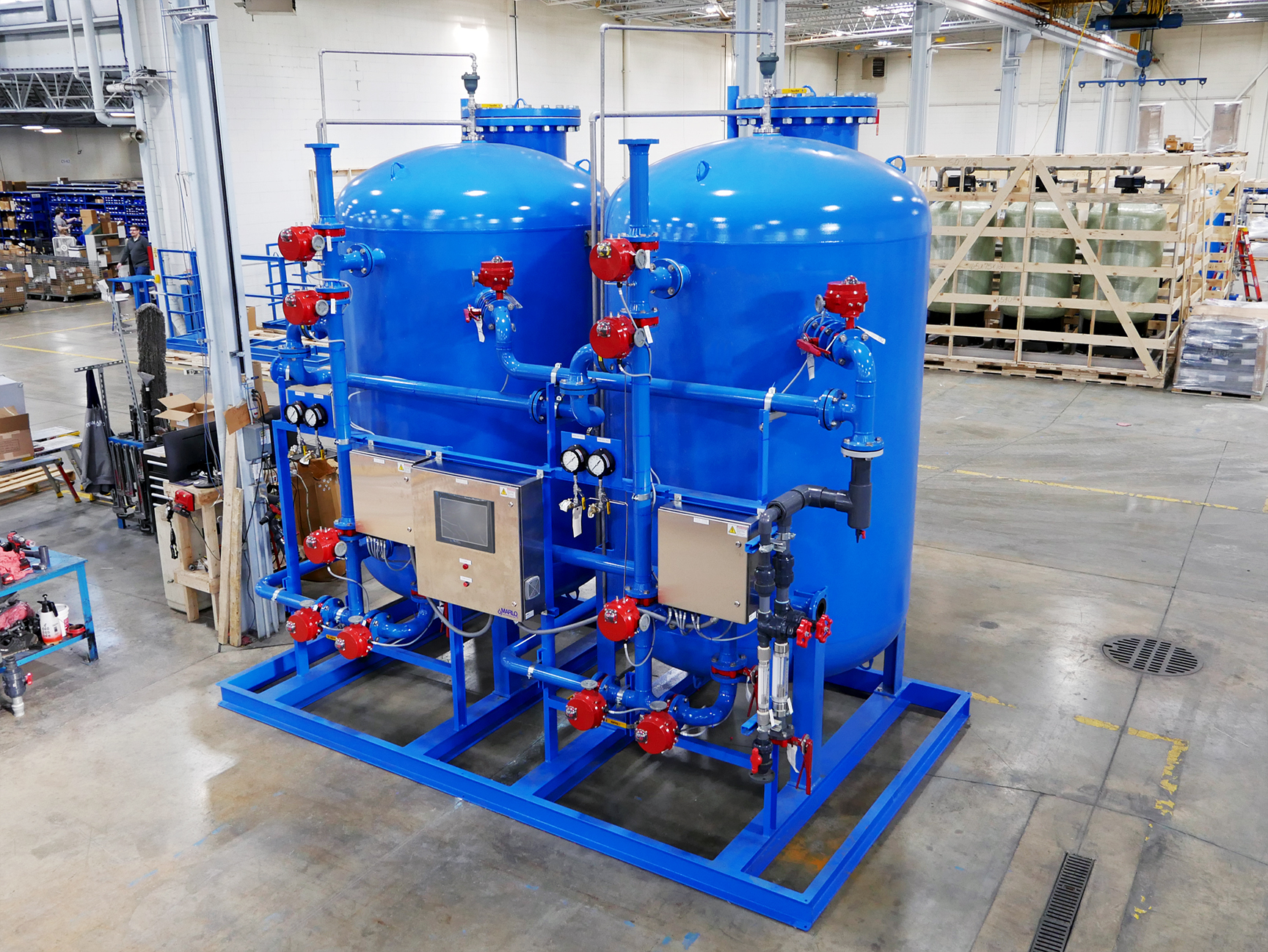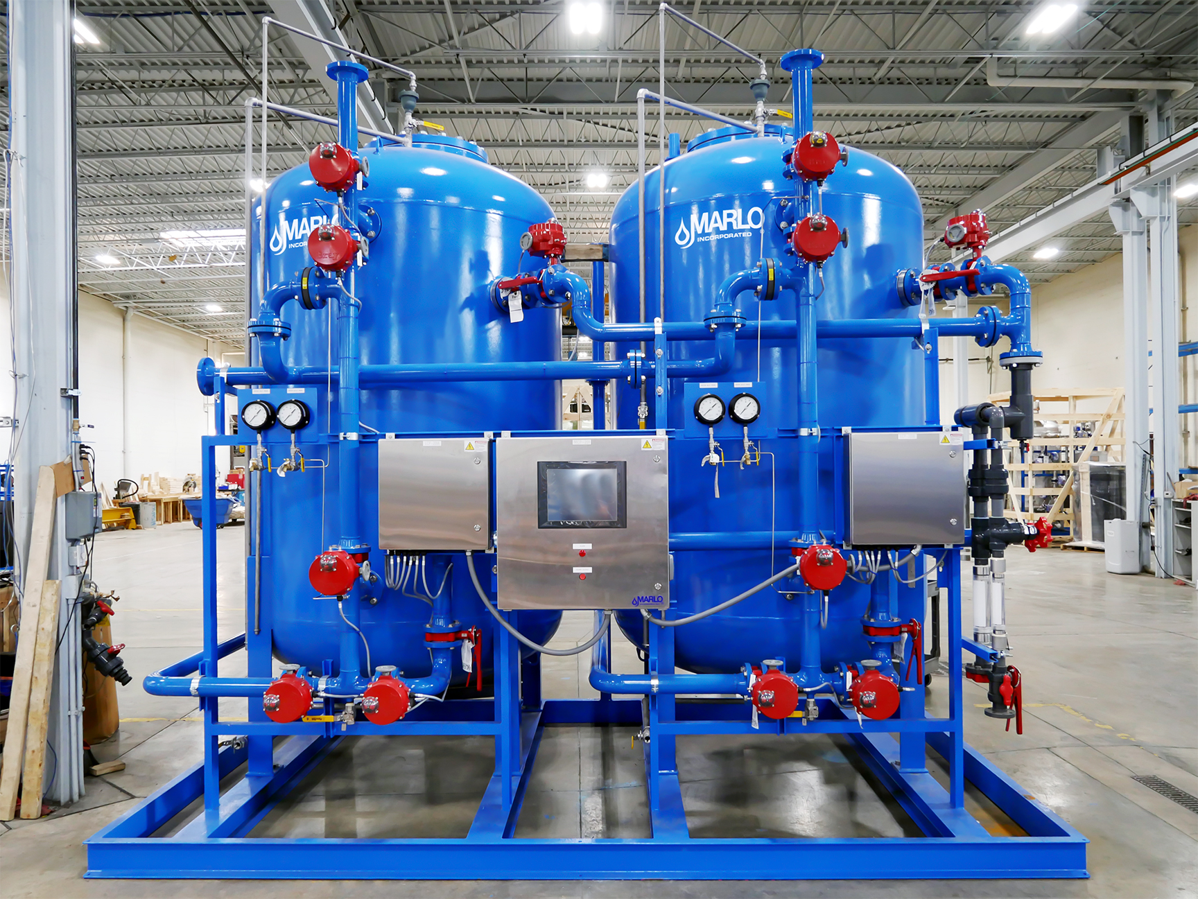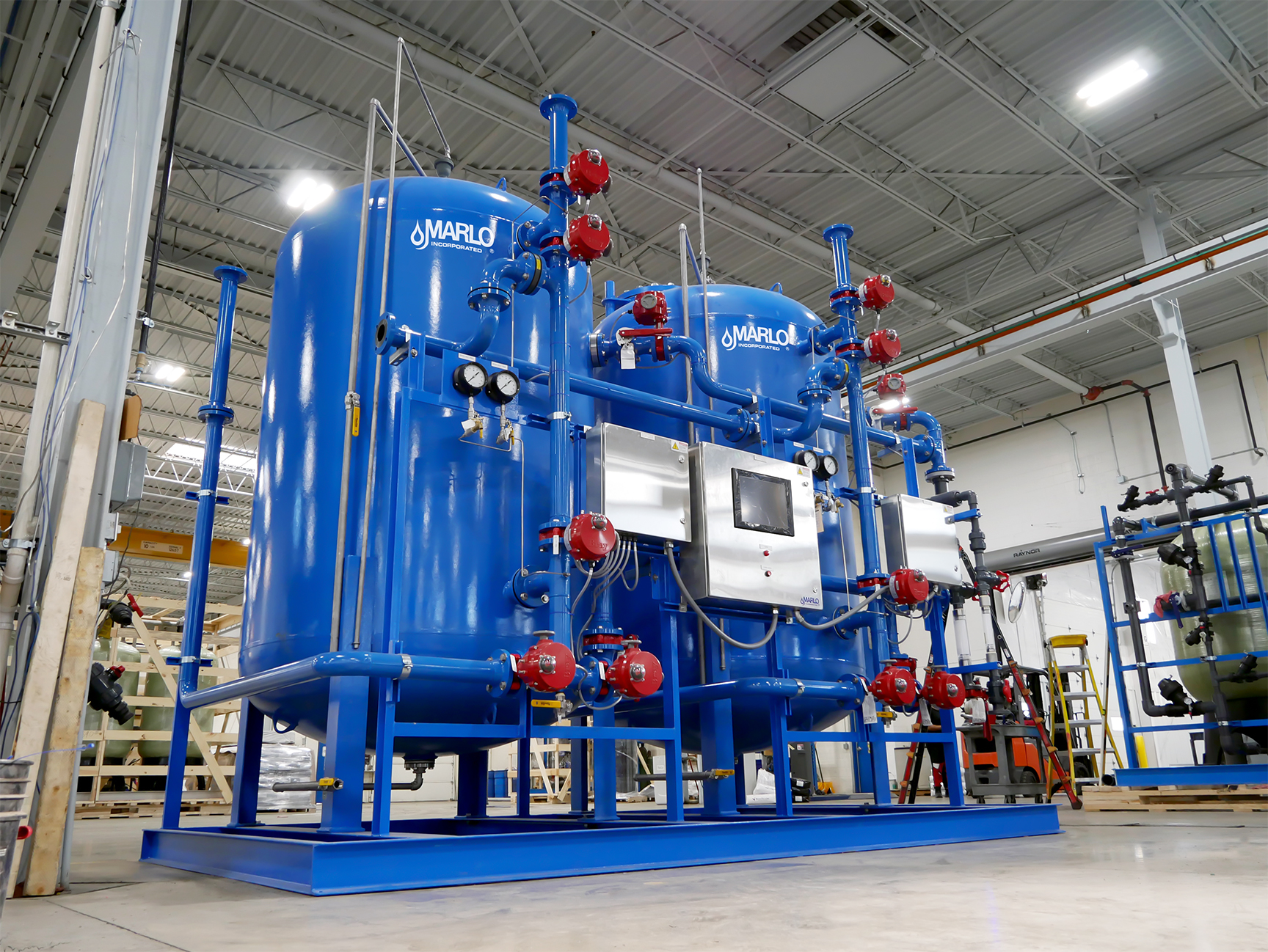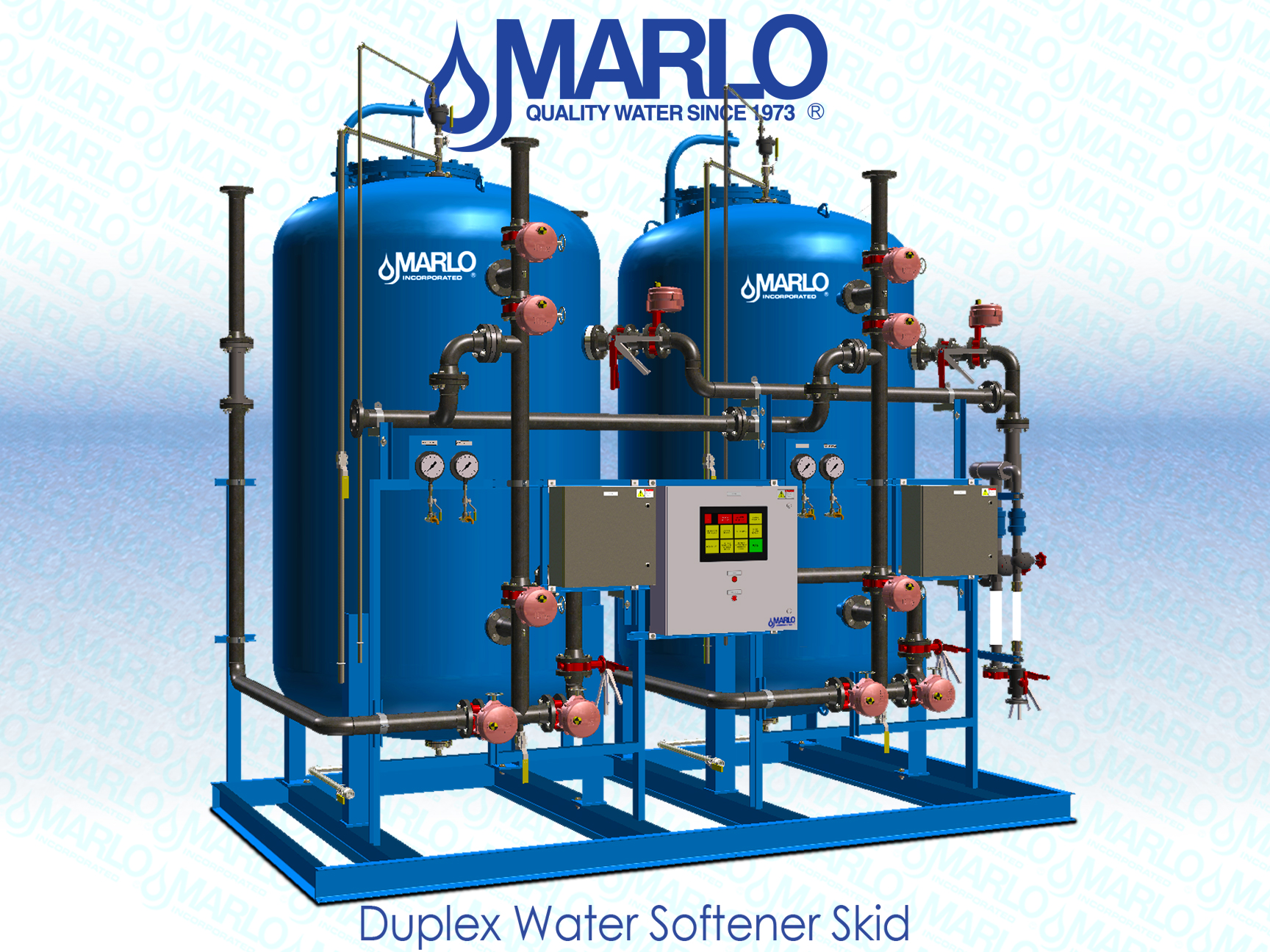 MARLO Duplex Water Softener Skid for the Central Utility Plant (CUP) at a Pulp & Paper Mill. Key features include 72” diameter epoxy-lined, ASME Code Stamped carbon steel pressure vessels, electric-actuated butterfly control valves, welded carbon steel pipework with 4” flanged service headers, and Allen-Bradley CompactLogix PLC/HMI control panel. Alternating flow configuration with 1-Vessel Online/1-Vessel Standby. Fully skid mounted, pre-piped, pre-wired and factory tested. Bulk brinemaker silo and brine pump skid provided but not shown.