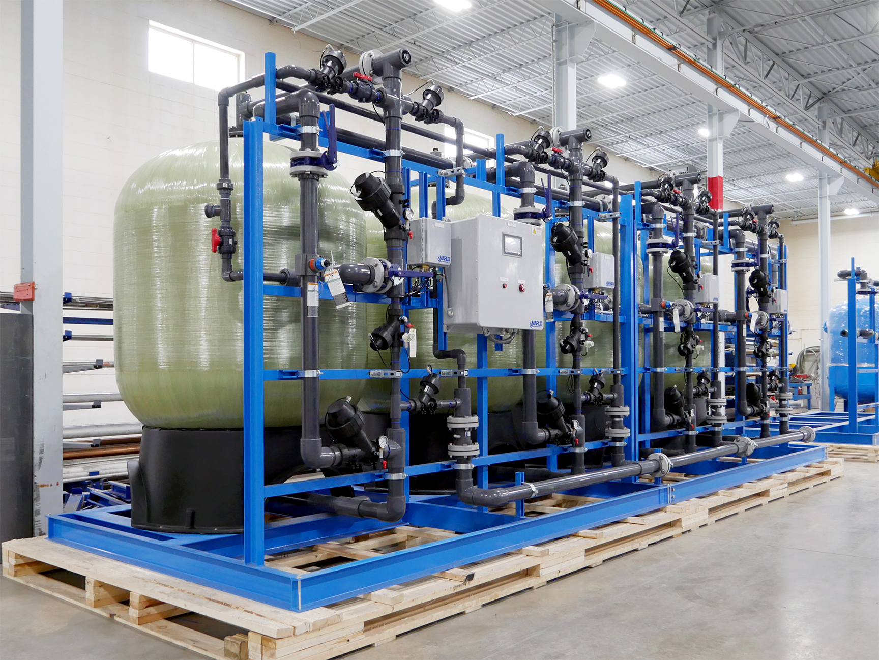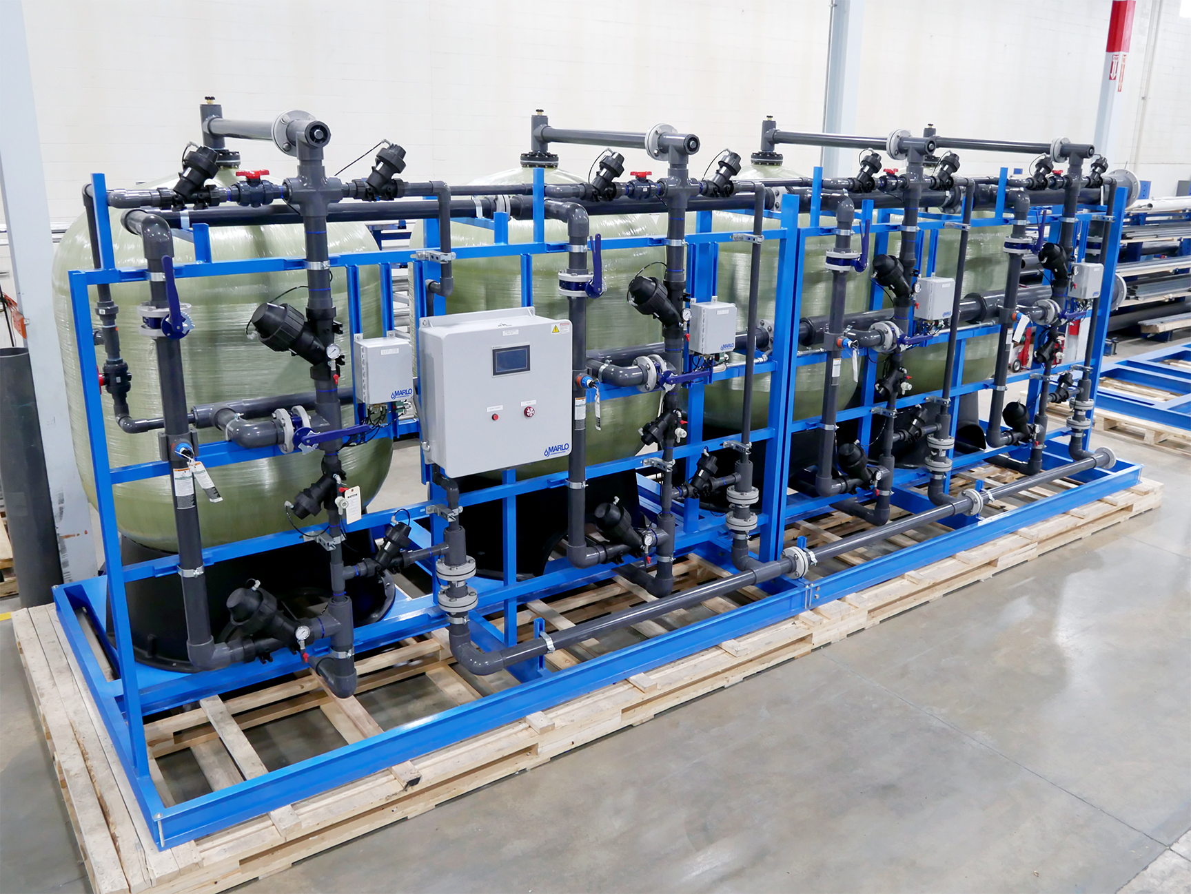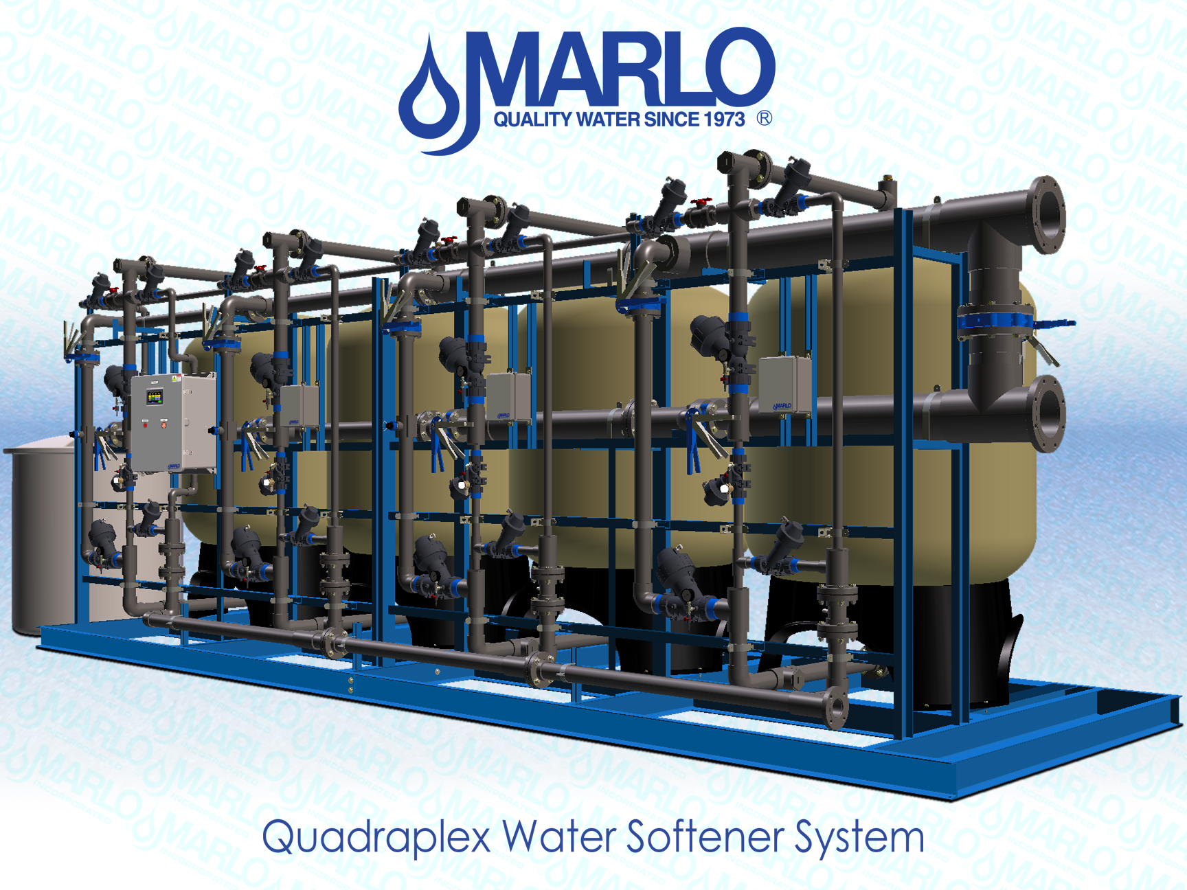 MARLO Quadraplex Water Softener System for an Electric-Vehicle (EV) Battery Production Plant. Key features include 63” Diameter, FRP ASME Code pressure vessels, AQ-MATIC diaphragm control valves, Sch 80 PVC pipework, Carbon Steel Skid/Frame assembly, and an Allen-Bradley PLC/HMI control system. Progressive flow configuration with 1-4 tanks online depending on actual water demand. Fully skid mounted, pre-piped, pre-wired and factory tested. The skid can be separated into (2) sections to better facilitate shipping and installation. Bulk brinemaker silo and brine pump skid provided but not shown.