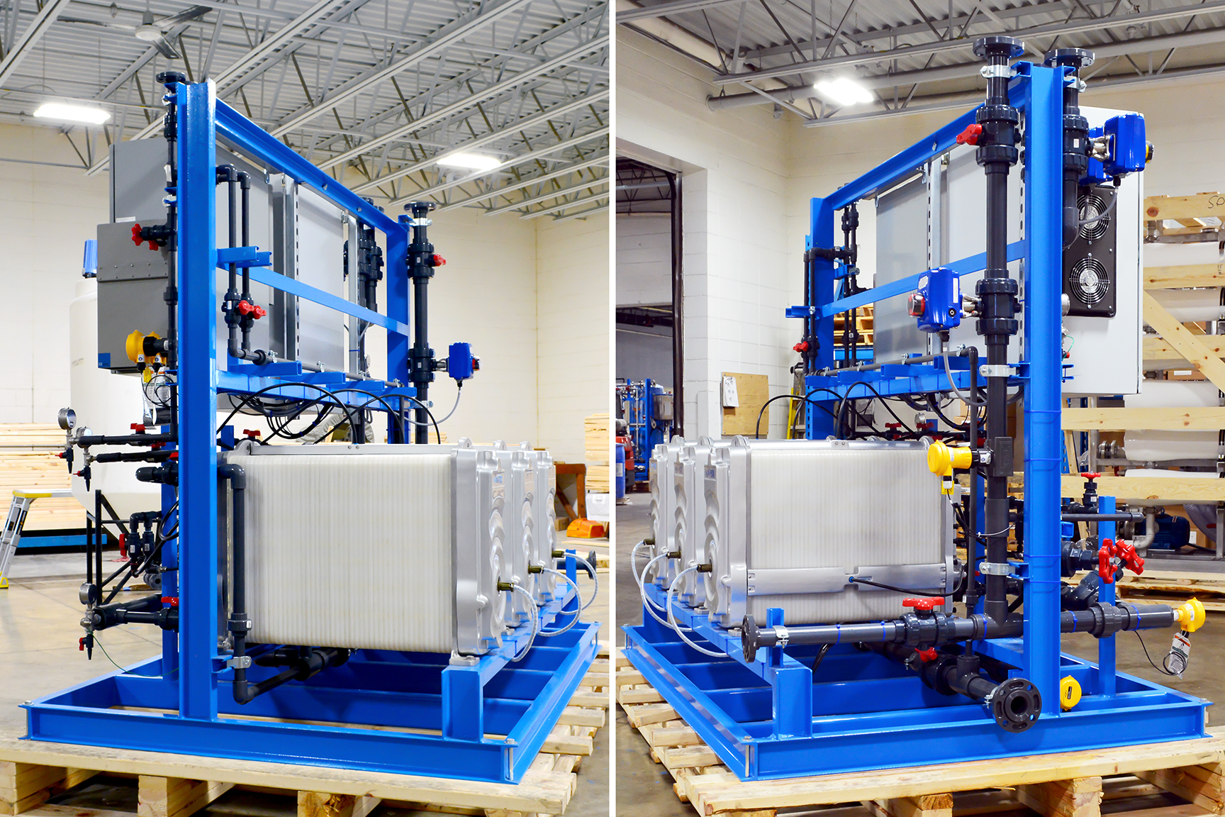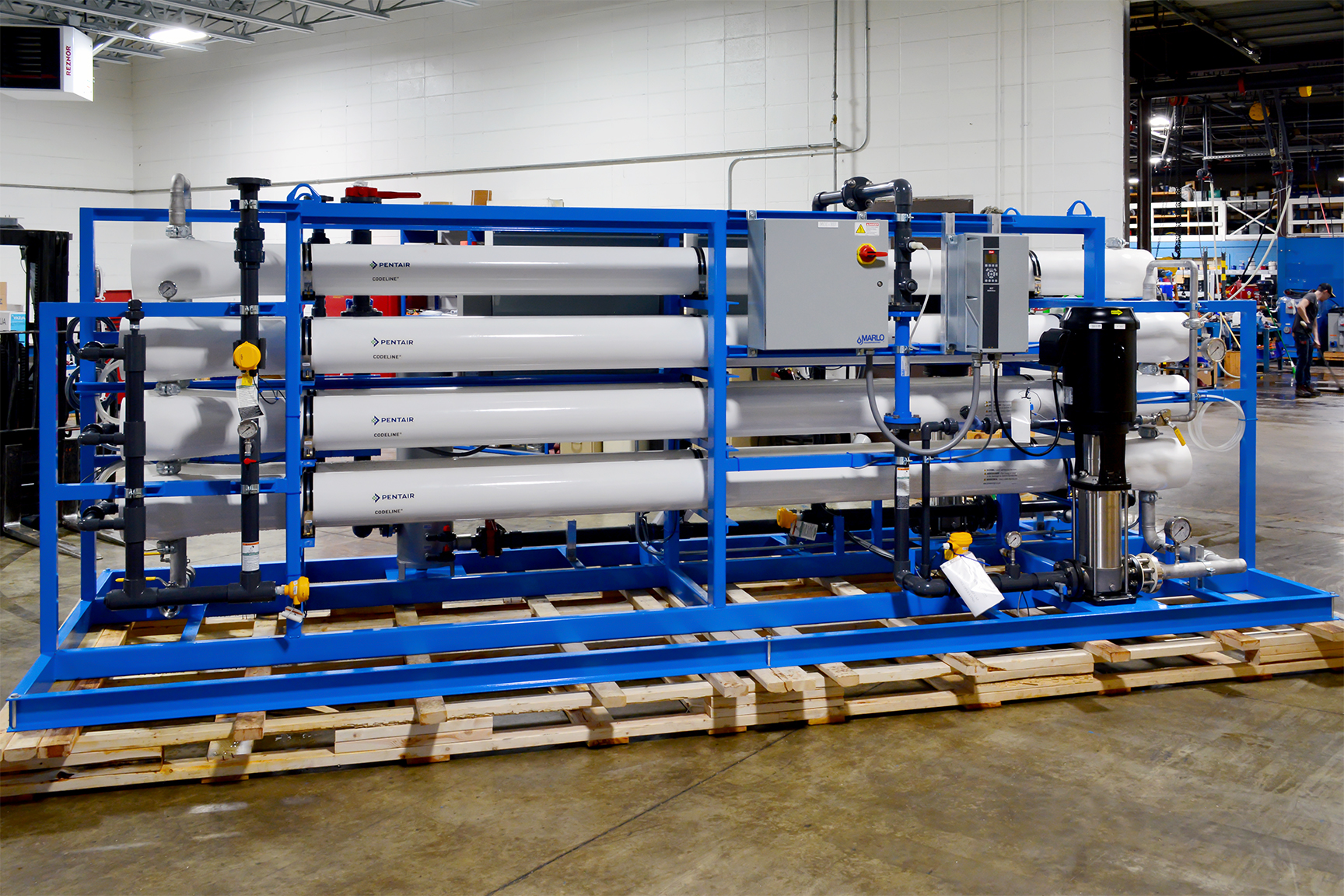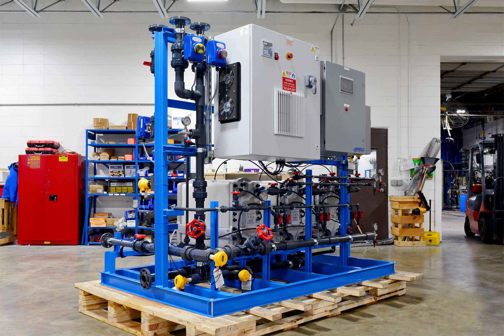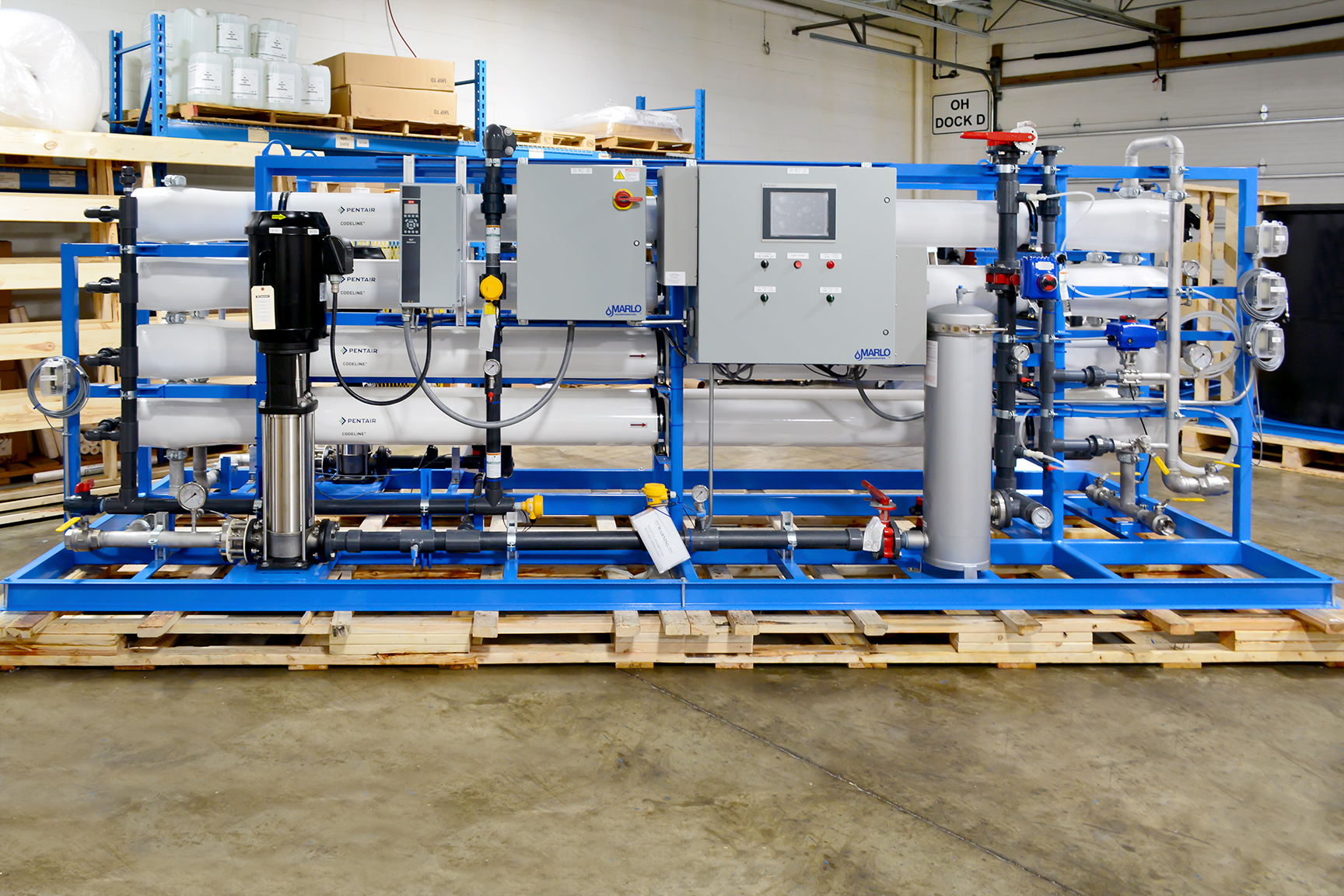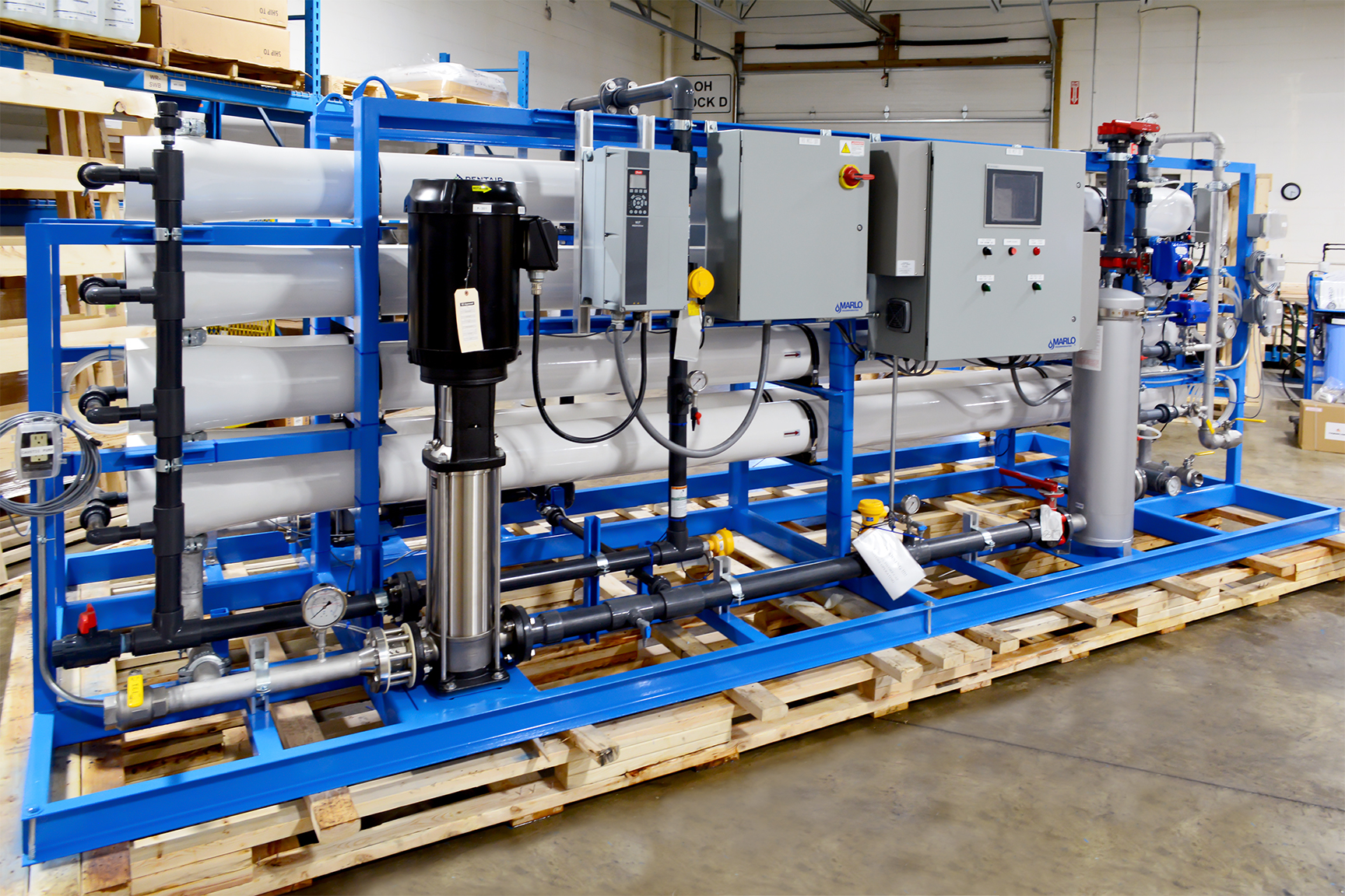 MARLO Industrial-Grade, Reverse Osmosis (RO) /Electrodeionization (EDI) Water Treatment System for On-Site Power Generation at a Sugar Processing Facility. The RO skid is a Two-Pass Design feeding the EDI skid with a final product flow of 75-GPM. Key features include Grundfos high pressure pumps with Variable Frequency Drives, Allen-Bradley CompactLogix PLC/HMI, and Signet instrumentation package. Fully Skid Mounted, Pre-Piped, Pre-Wired and Factory Tested.